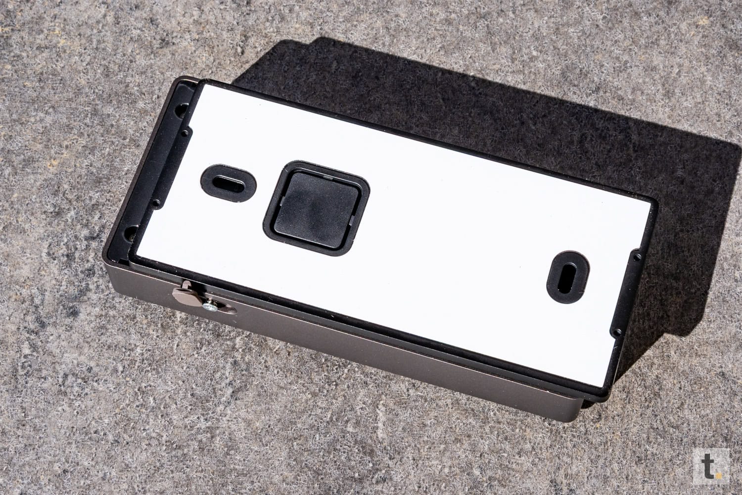 Zunächst ist eine Schraube an der seitlichen Gehäuseseite unterhalb der Abdeckung der Türklingel zu lösen. Anschließend wird die Montagelatte nach unten zum Entriegeln verschoben, wodurch die Türklingel vom Halter abgenommen werden kann.