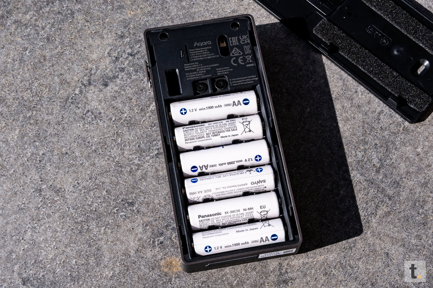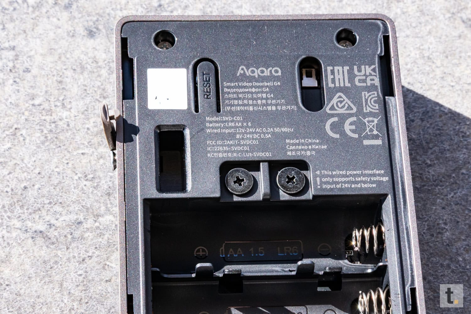 Anschließend erfolgt die Stromversorgung. Entweder werden die sechs mitgelieferten AA-Batterien eingesetzt oder ein vorhandener Klingeldraht angeschlossen, wobei die Polung beim Kabelbetrieb keine Rolle spielt. Setzen Sie die Türklingel anschließend wieder auf die Halterung, bis sie einrastet und sichert diese wieder mit der seitlichen Schraube.