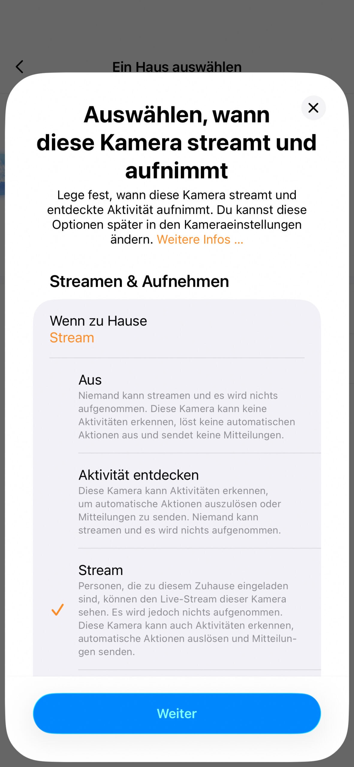 - 720p: Reduzierte Auflösung für flüssigere Übertragung bei schwächerem WLAN oder um Speicherplatz zu sparen.