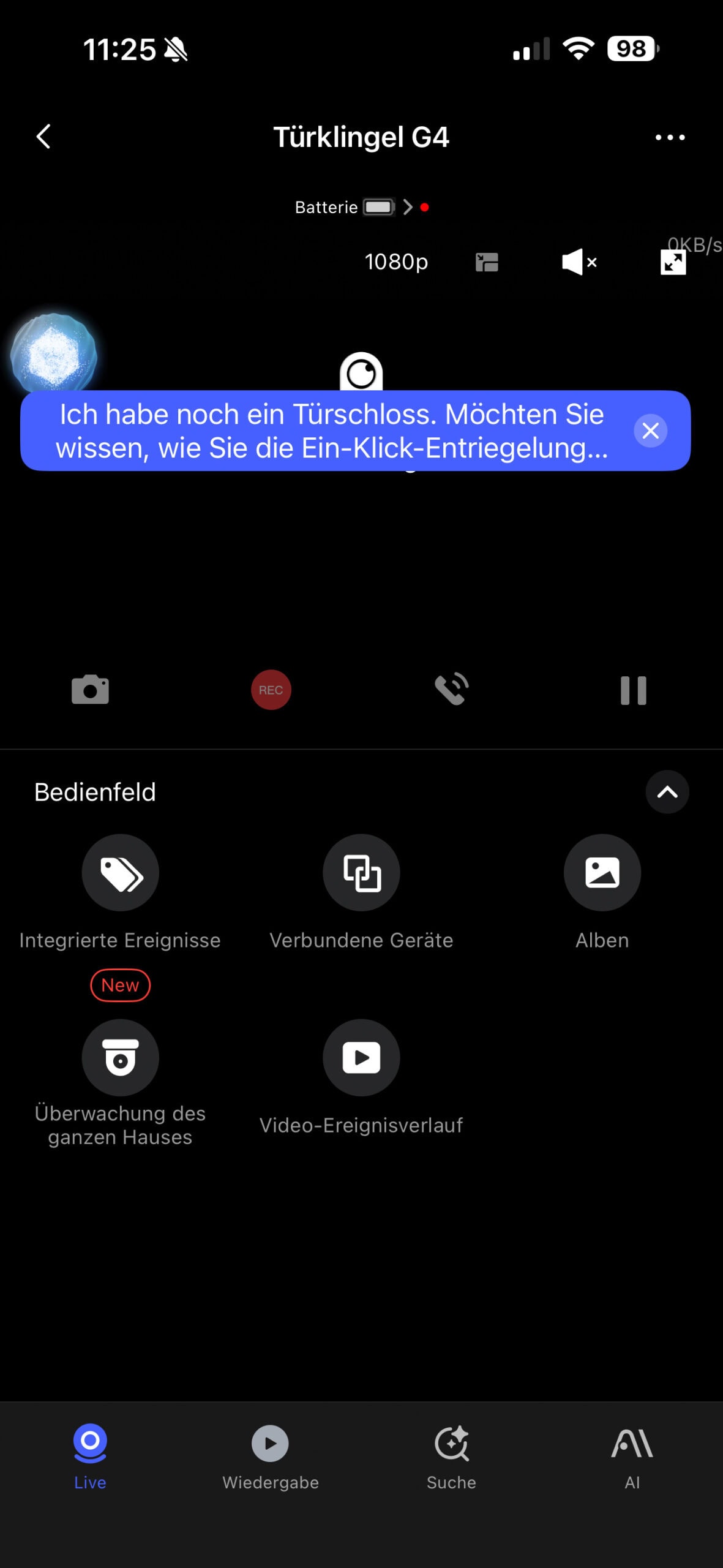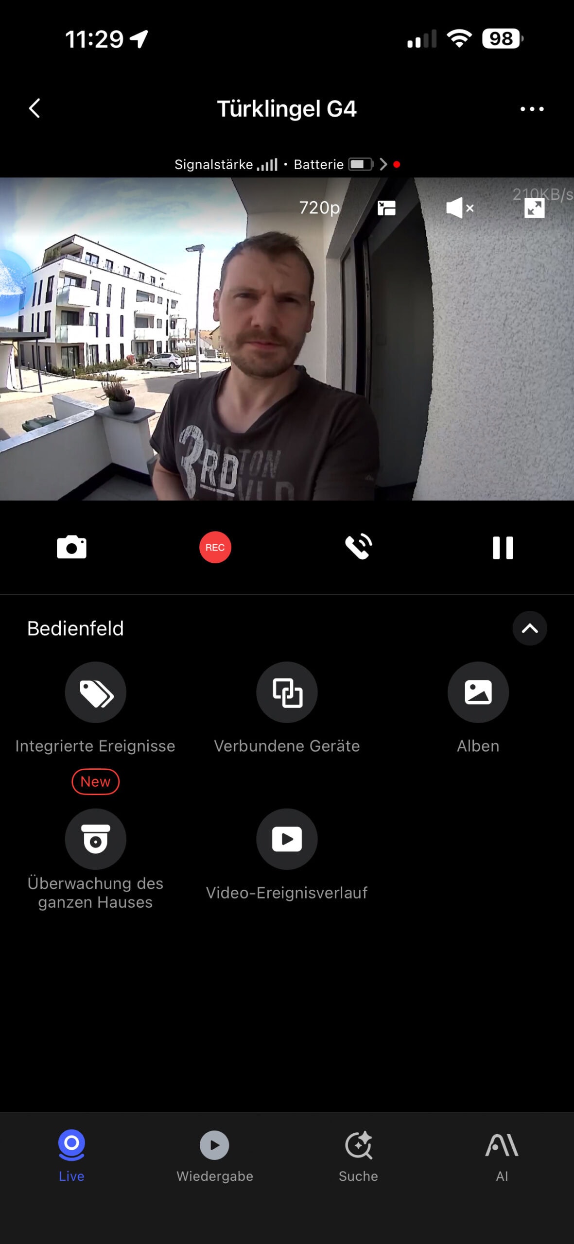 Im Mittelpunkt der Anwendung befindet sich die Kameraansicht der Türklingel, die in mehrere Untermenüs strukturiert ist. Im Bereich „Live“ wird das aktuelle Kamerabild in Echtzeit übertragen und die Gegensprechfunktion ist unmittelbar verfügbar. Unter „Wiedergabe“ können gespeicherte Aufnahmen von der Micro-SD-Karte oder aus der Cloud abgerufen werden. Die „Suche“ ermöglicht ein gezieltes Auffinden von Ereignissen anhand von Zeit oder Aktivität. Im Bereich „AI“ wird die Gesichtserkennung verwaltet, einschließlich der Zuordnung bekannter Personen und der Verwaltung intelligenter Ereignisse.