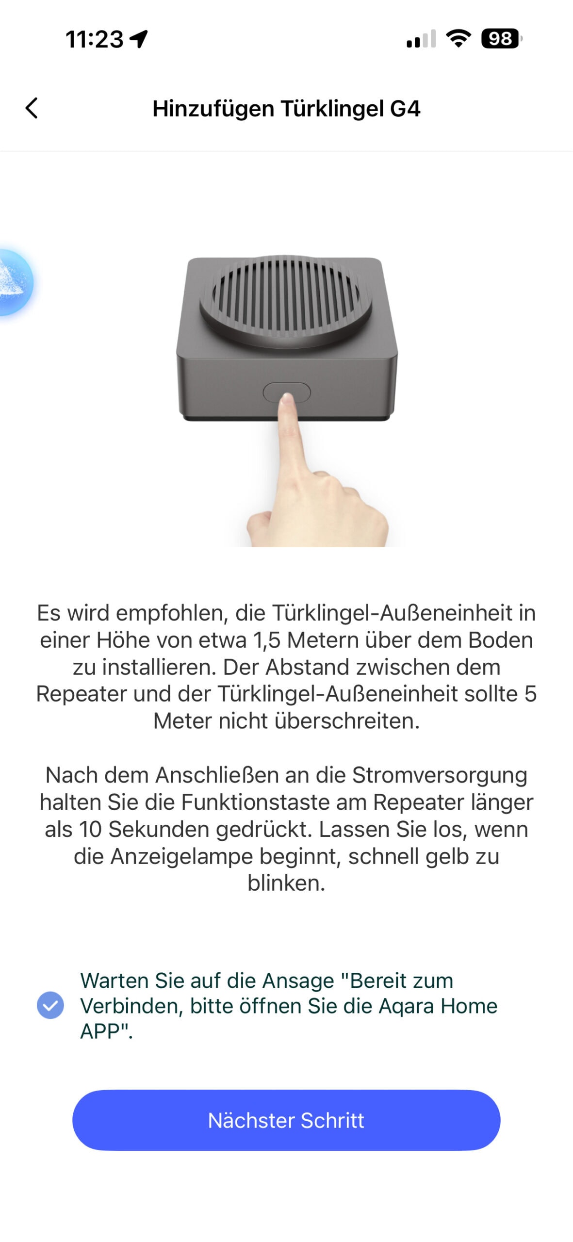 Der Chime-Repeater ist für die Installation im Innenraum konzipiert. Er kann mittels Klebepads an der Wand befestigt oder an einem beliebigen Ort platziert und über den USB-C-Anschluss mit Strom versorgt werden. Die Einrichtung der Geräte erfolgt schrittweise über die Aqara Home App. Nach Erstellung eines Benutzerkontos (E-Mail-Adresse, Passwort, optional Telefonnummer) wird das Gerät mittels QR-Code-Scan eingerichtet.