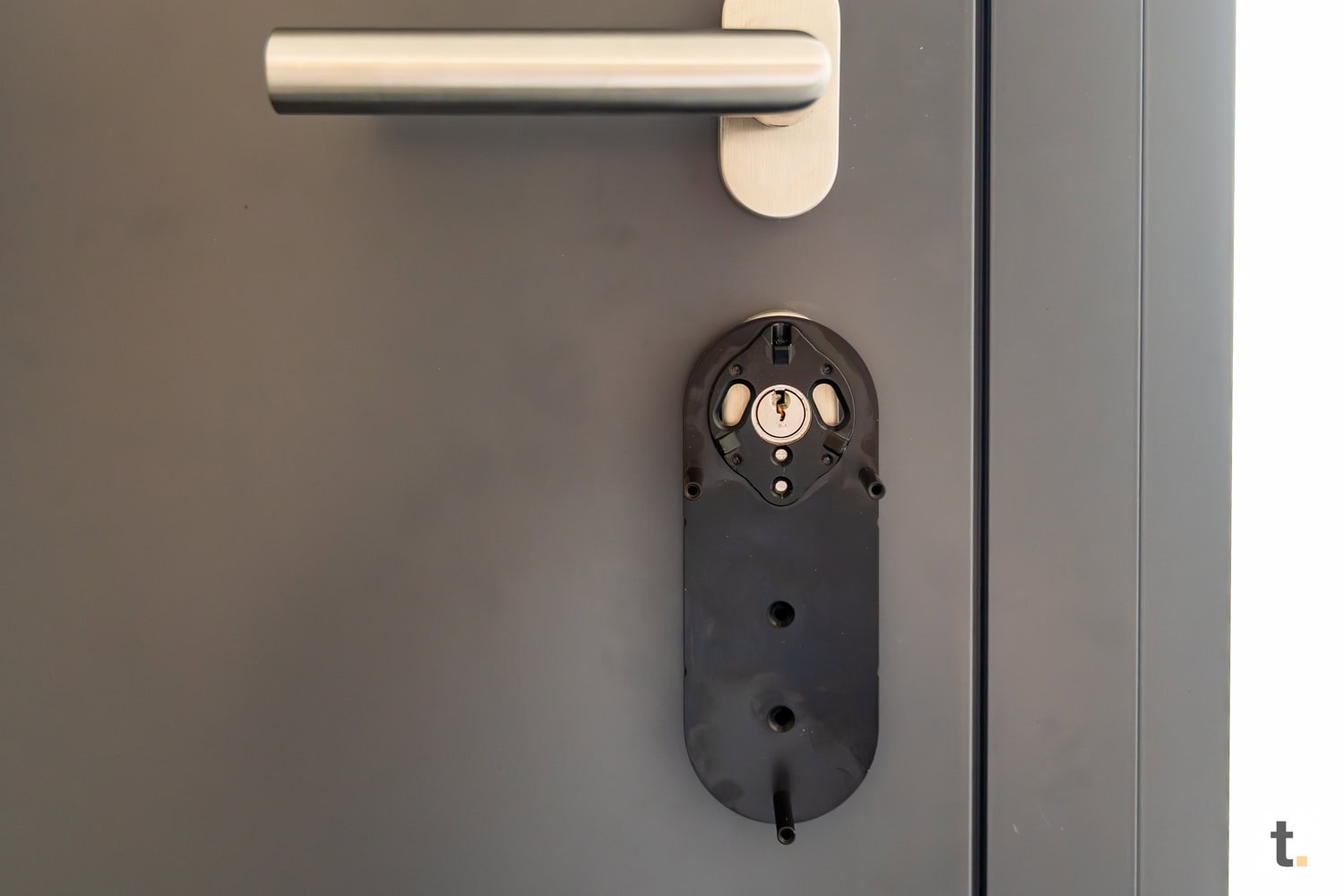 Nach erfolgreicher Befestigung der Montageplatte mittels der drei mitgelieferten Madenschrauben habe ich die Motoreinheit auf die Halterung aufgesetzt, einrastend fixiert und mit den drei im Lieferumfang enthaltenen Schrauben verschraubt. Nach dem Einlegen des Akkus wird das Schloss automatisch aktiviert und führt eine Kalibrierung des Drehwegs durch, um die präzisen Schließ- und Öffnungspunkte zu ermitteln. Abschließend wird die Frontblende aufgesetzt, wodurch die Installation des Amara U200 Smart Lock abgeschlossen ist. Das externe Keypad wird separat montiert, ebenfalls wahlweise durch Verschraubung oder Verklebung und kann aufgrund seiner IPX5-Zertifizierung problemlos im geschützten Außenbereich installiert werden.