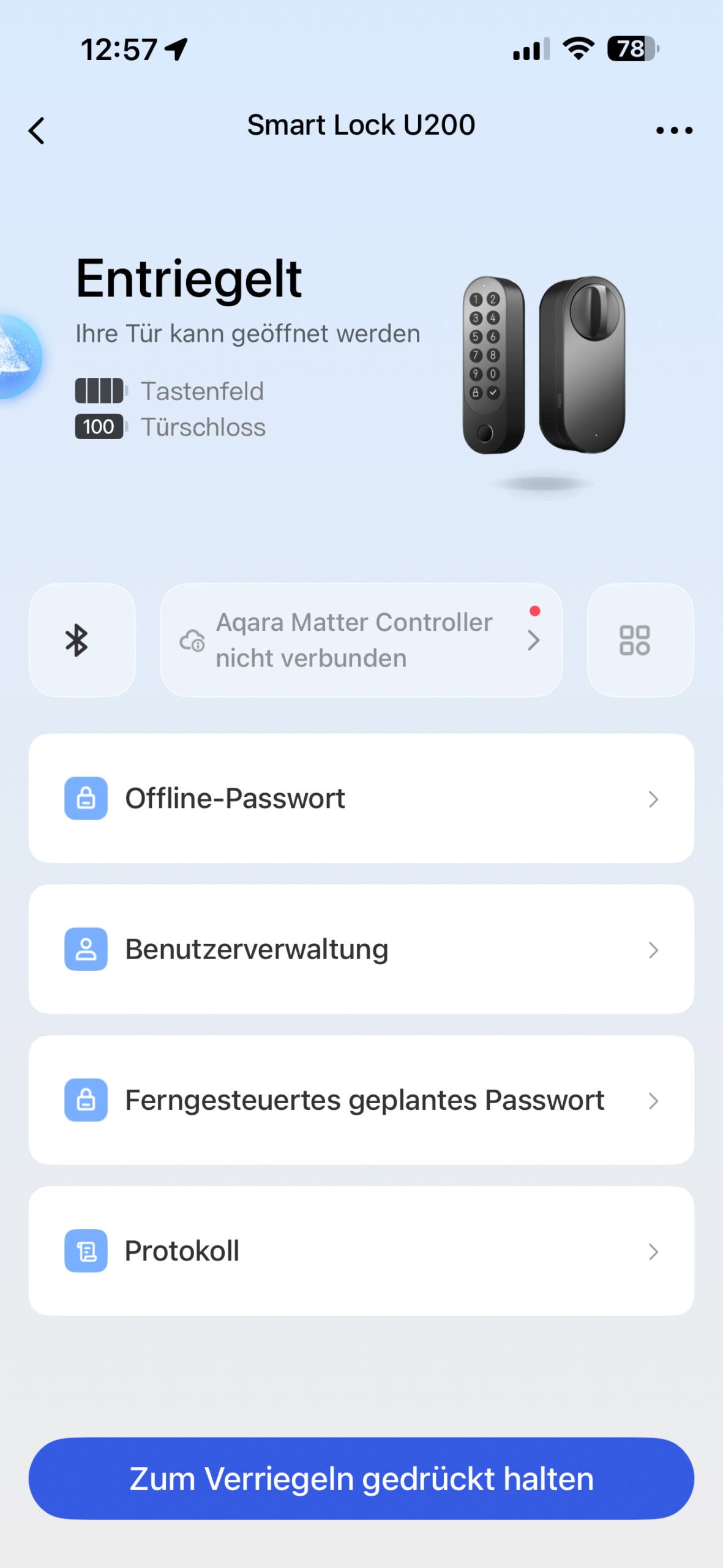 Das Schloss ist kompatibel mit Matter over Thread (Matter 1.2) und ermöglicht somit eine nahtlose Integration in führende Smart-Home-Plattformen wie Apple Home, Google Home und Amazon Alexa. Über Matter können grundlegende Funktionen wie Ver- und Entriegeln, Statusabfragen sowie die Implementierung von Automationen realisiert werden.