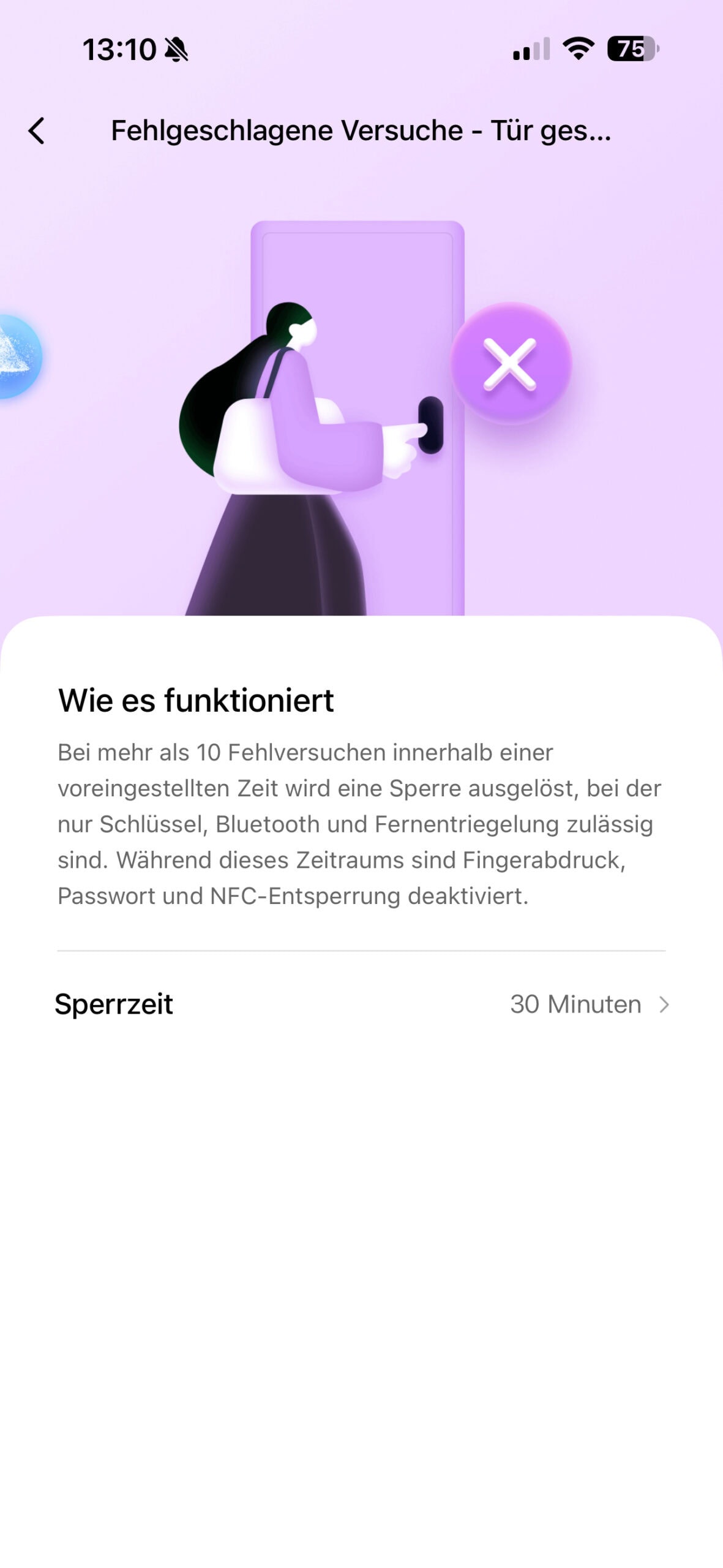 | Sperrmodi | Automatischer Sperrmodus (Auto-Lock) Immer verriegelt (Lock-Away Mode) Offenmodus (Stay-Unlock Mode) Zeitgesteuerte Sperrmodi |