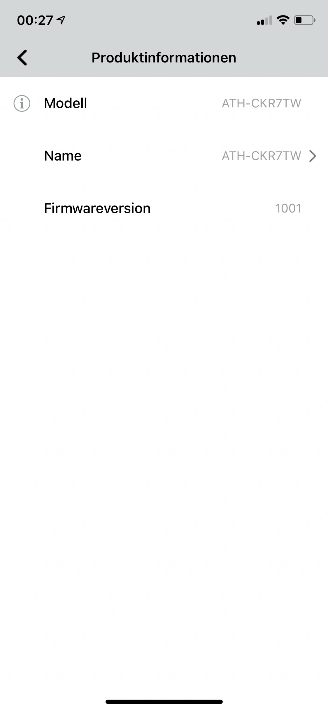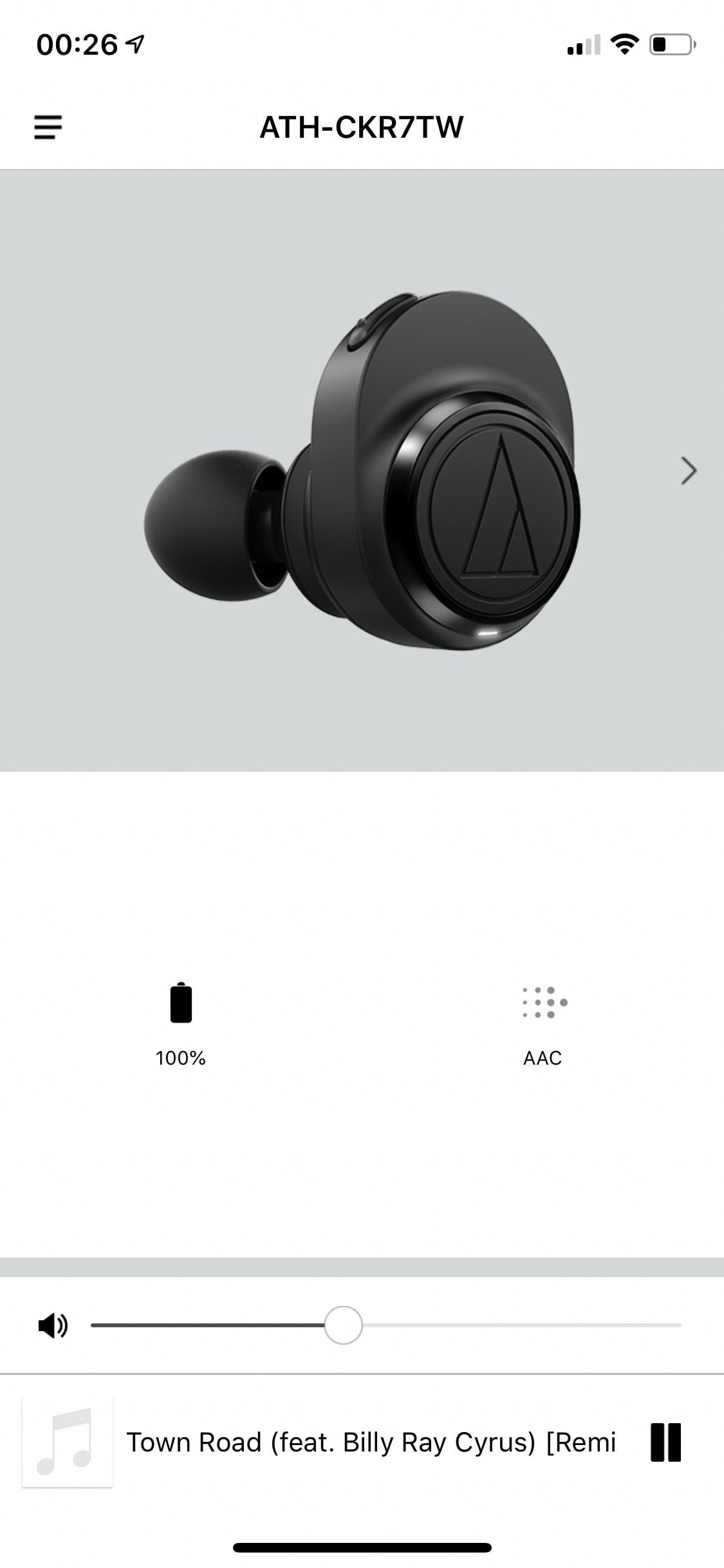 Startet man die App, landet man, sofern die ATH-CKR7TW mit dem Smartphone verbunden sind, auf der Startseite. Auf dieser Startseite wird einem der In-Ear Ohrhörer angezeigt und zudem kann man direkt darunter per Schieberegler die Lautstärke ändern und den Titel der gerade weitergegeben wird einsehen. Jedoch muss man dazu nicht zwingend in die App gehen, denn man kann den aktuellen Titel auch in der Musik App ändern, wie z. B. bei mir via Apple Music.