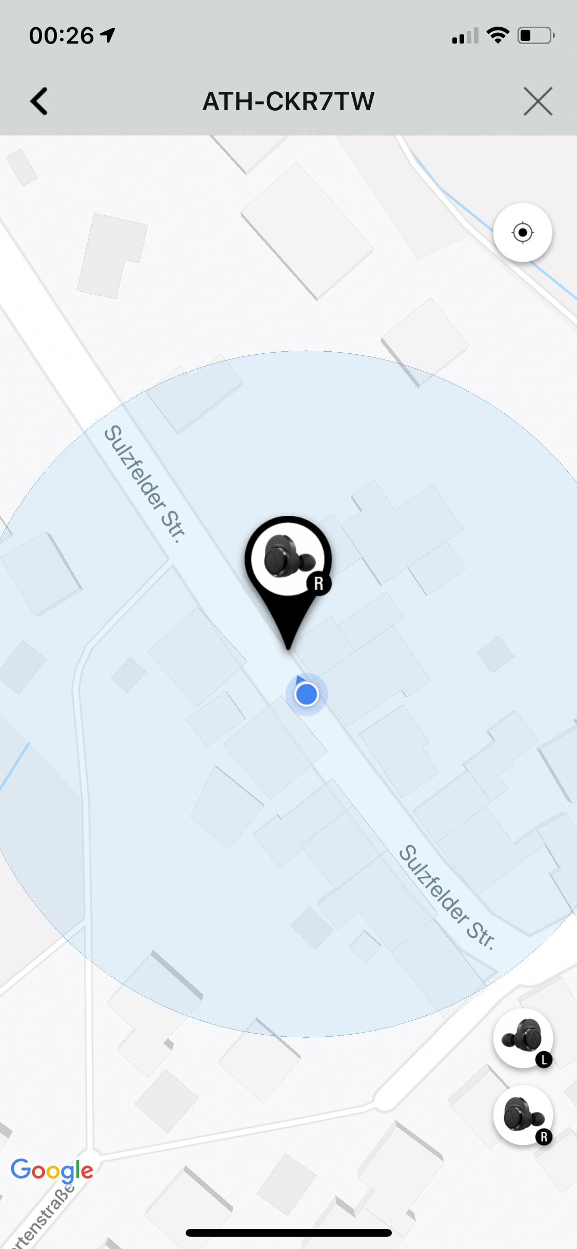 Über die drei horizontalen Striche im linken oberen Rand gelangt man in ein weiteres Untermenü. Hier kann man praktischerweise den letzten Standort der True-Wireless Ohrhörer abrufen, sofern man z. B. einen davon verloren hat. Um diese Funktion nutzen zu können ist es jedoch erforderlich, dass ihr der App den Zugriff auf eure GPS-Daten gebt. Zu guter Letzt kann man hier noch die Bedienungsanleitung und die aktuelle Firmwareversion usw. einsehen.