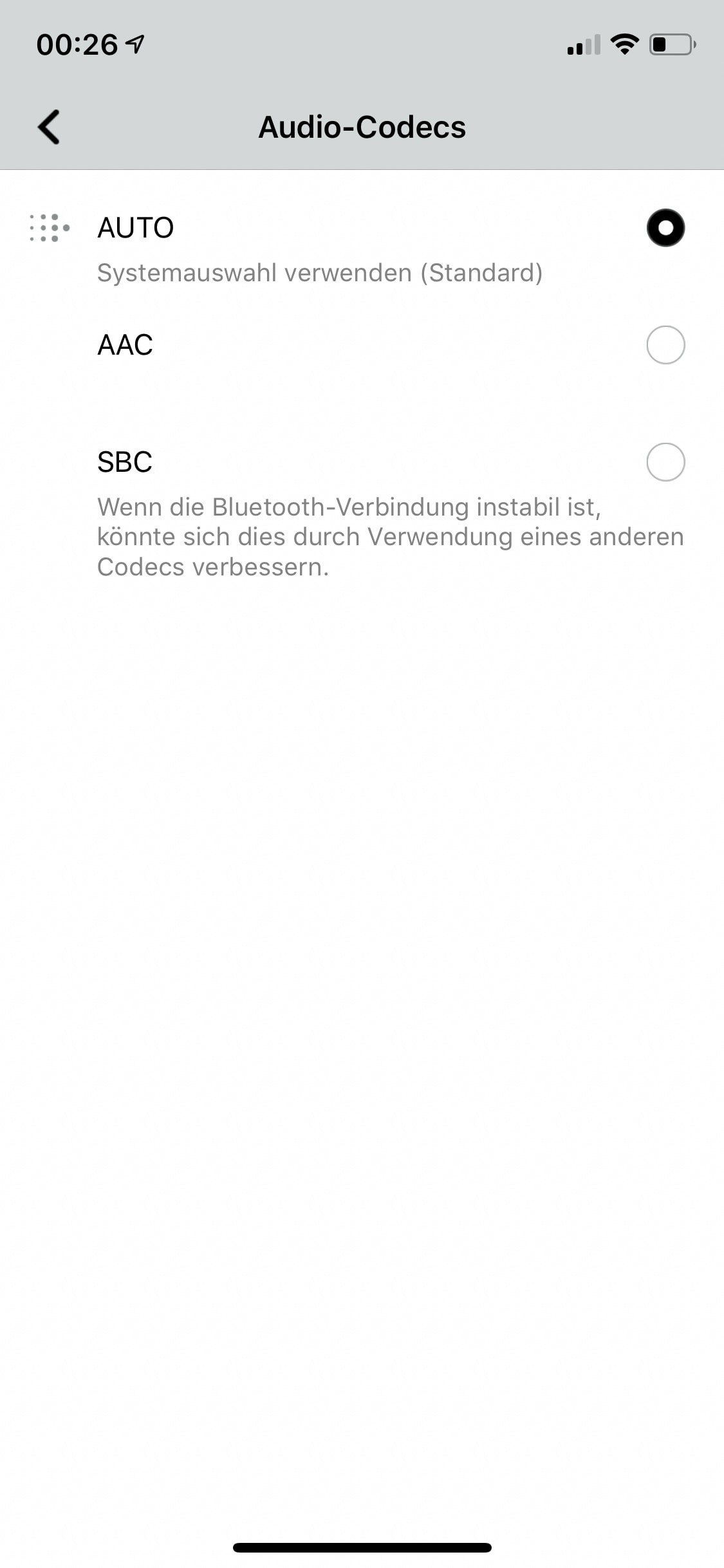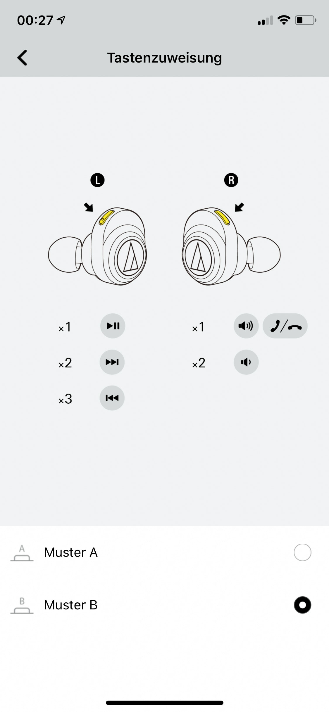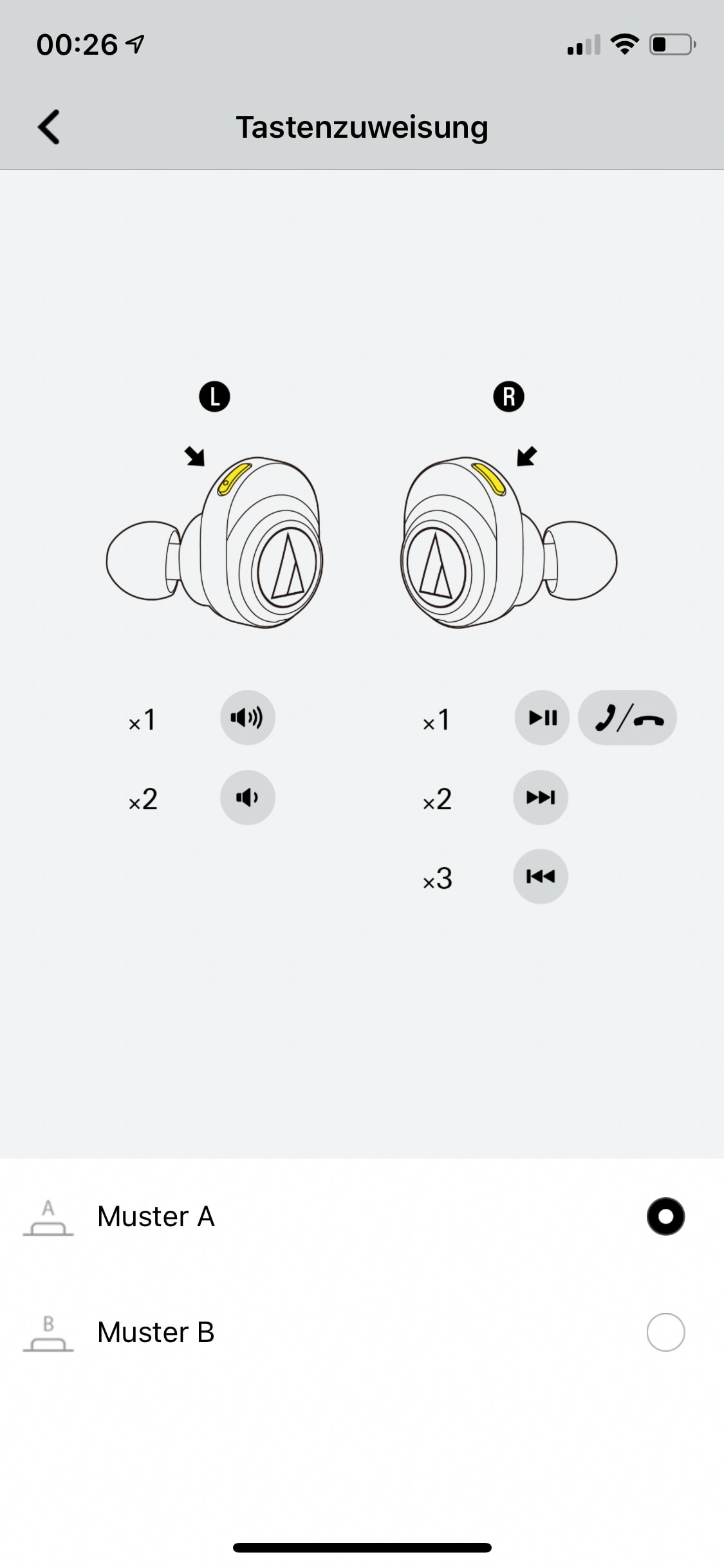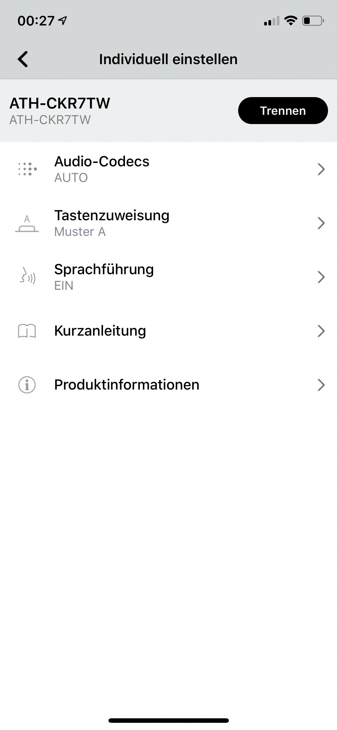 In der Mitte der Startseite wird einem der aktuelle Akkustand in % angezeigt und direkt daneben wird bei Musikwiedergabe der aktuell verwendeten Audio-Codec´s in meinem Fall AAC, angezeigt. Drückt man auf den Pfeil des oben abgemeldeten In-Ear, dann gelangt man in das Einstellungsmenü. Hier kann man unter anderem, die Verbindung bei trennen, den Audio-Codec manuell ändern, die Tastenzuweisungen von „Muster A“ auf „Muster B“ ändern, sowie die Kurzanleitung einsehen.
