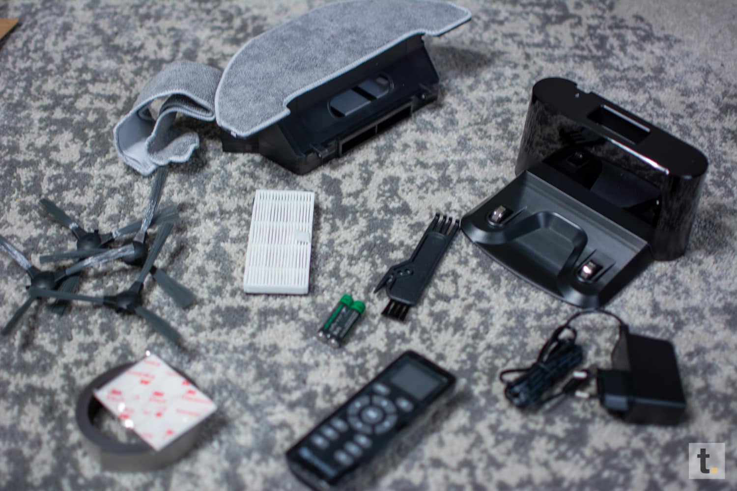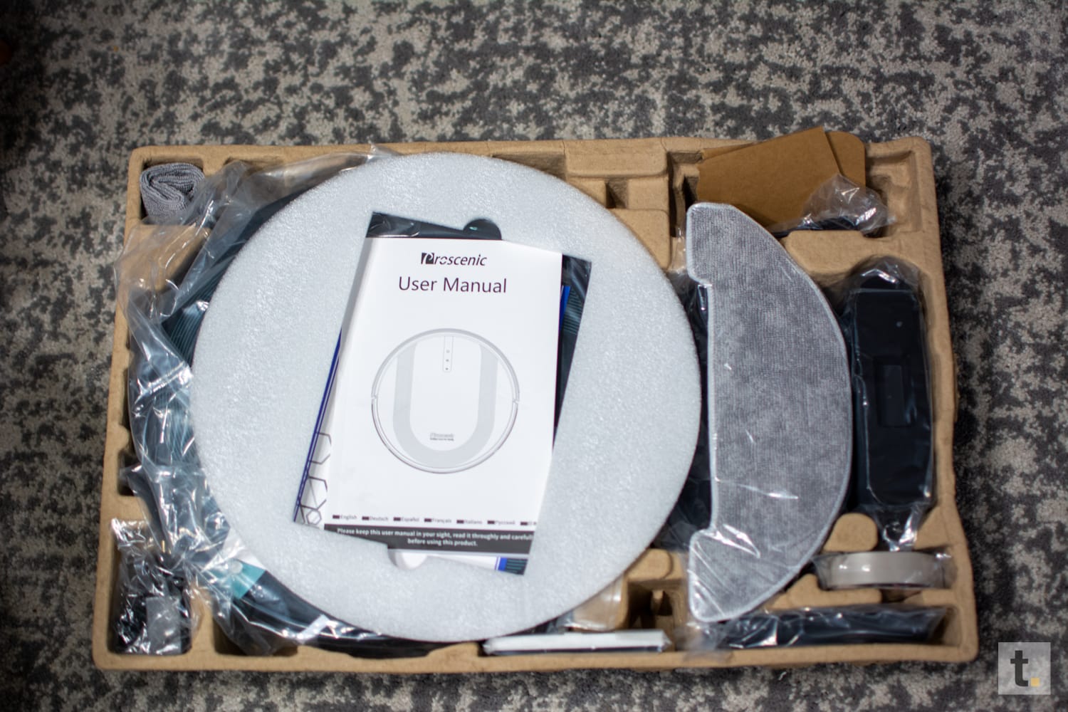 Der Proscenic 850T wird in einer braunen Versandkartonage geliefert und besitzt einen Tragegriff. Darauf leider nur der Roboter zu sehen ist. Leider fehlt auch die Modellkennzeichnung, was ich persönlich schade finde. Nach dem Öffnen ist ein weiterer Recyclingkarton vorzufinden, welcher Aussparungen für das Produkt und die dazugehörigen Teile hat. Dadurch wird verständlicherweise verhindert, dass der Inhalt verrutschen kann und mögliche Beschädigungen erleiden kann. Jedes Teil wurde zusätzlich separat in eine Nylonfolie eingepackt, um diese vor Kratzer zu schützen. Im Lieferumfang enthalten sind: Roboter inkl Saugbehälter ohne Wischfunktion; zusätzlicher Saugbehälter inkl. Wischfunktion; 4 Bürsten; 2 Wischtücher – eines montiert und eines als Ersatz; Ladestation inkl. Netzteil, 3 lfm Magnetband zur Zonensperrung; Fernbedienung inkl. 2 AAA Batterie; 2 Filter – ebenfalls einer vormontiert und einer als Ersatz; Reinungsbürste und eine Bedienungsanleitung.