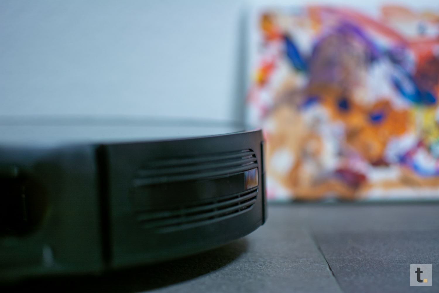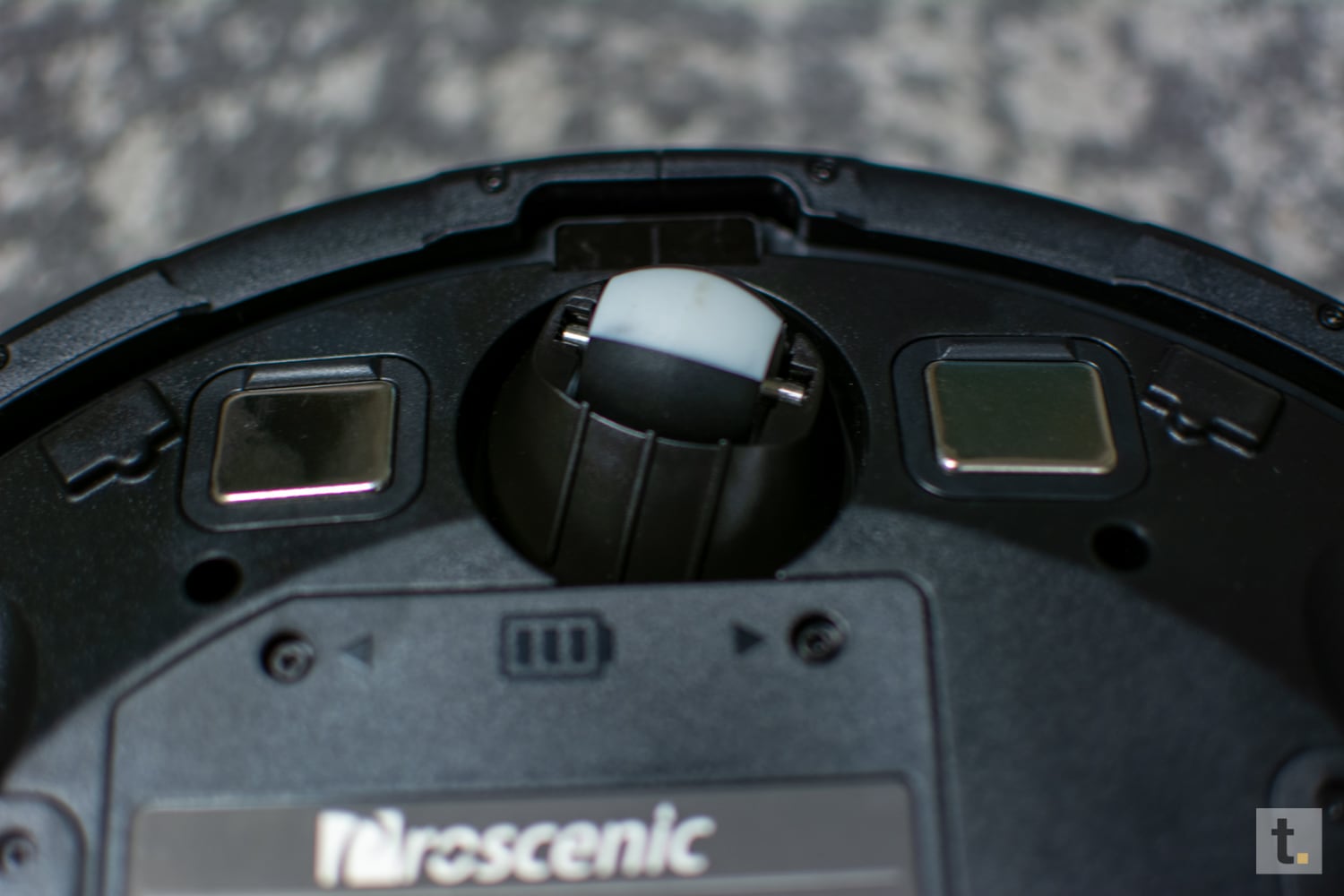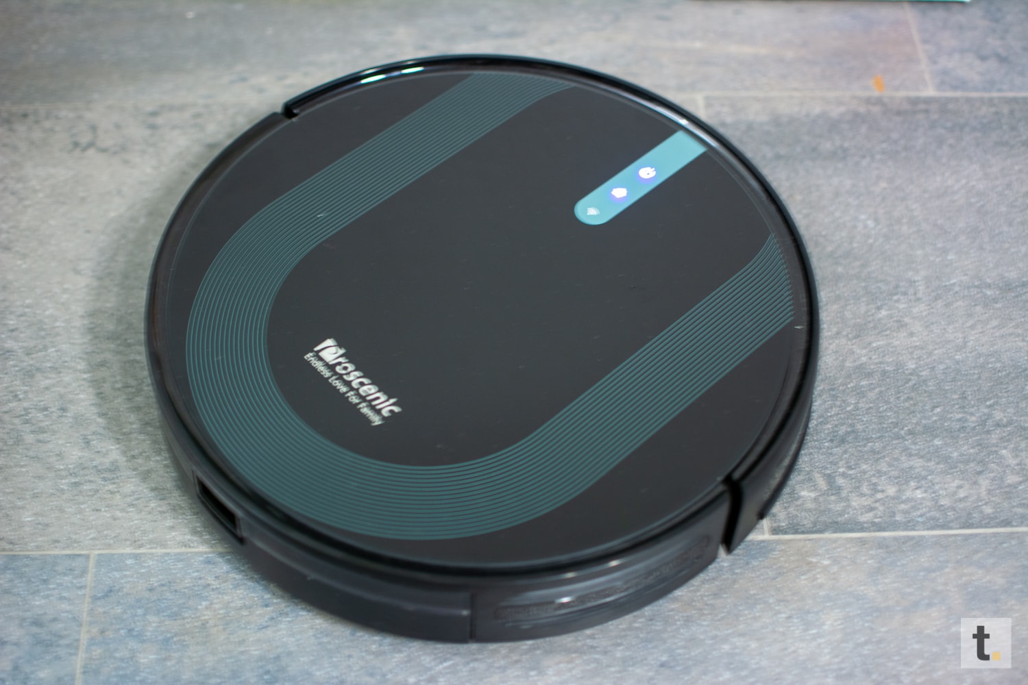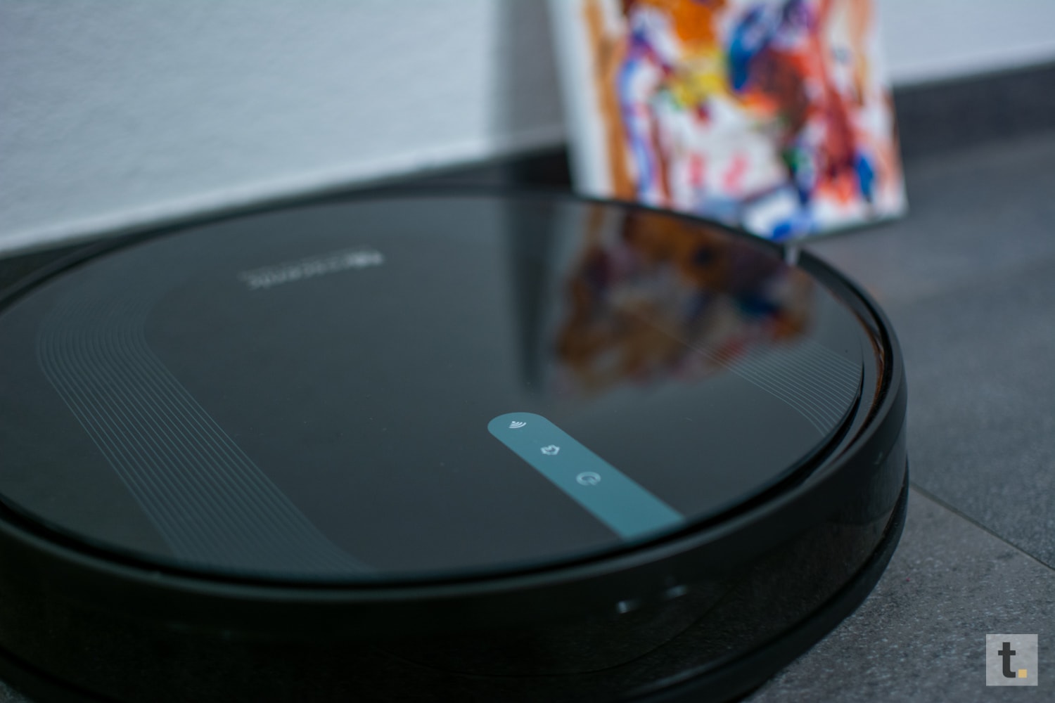 Generell tendiert der Hersteller zu dunkleren Farbtönen. Das obere Teil ist aus Glas mit einem U-förmigen, leicht bläulichen Liniendesign. Allerdings auch ein Staubmagnet. Mit einem Durchmesser von 32 Zentimeter und einer Höhe von 8,3 Zentimetern ist dieser Helfer recht klein gehalten, im Vergleich zu vielen anderen Robotern.