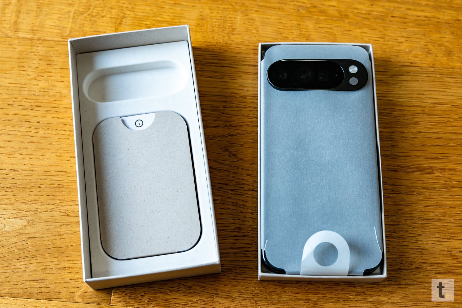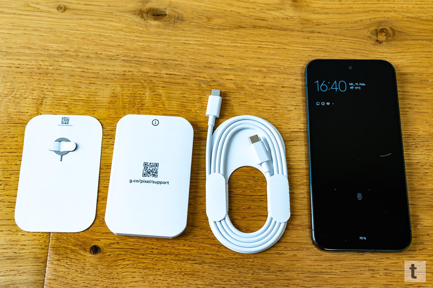 Das Smartphone ist sicher und zentral positioniert. Ein SIM-Eject-Tool ermöglicht das einfache Einsetzen der SIM-Karte. Ein USB-C-auf-USB-C-Kabel ist für das Laden und die Datenübertragung vorgesehen. Eine Kurzanleitung und Sicherheitshinweise sind ebenfalls enthalten. Wie bereits beim Pixel 9 Pro XL und anderen Smartphone-Herstellern, darunter Apple, wird im Lieferumfang jedoch kein Netzteil und keine Kopfhörer mitgeliefert.
