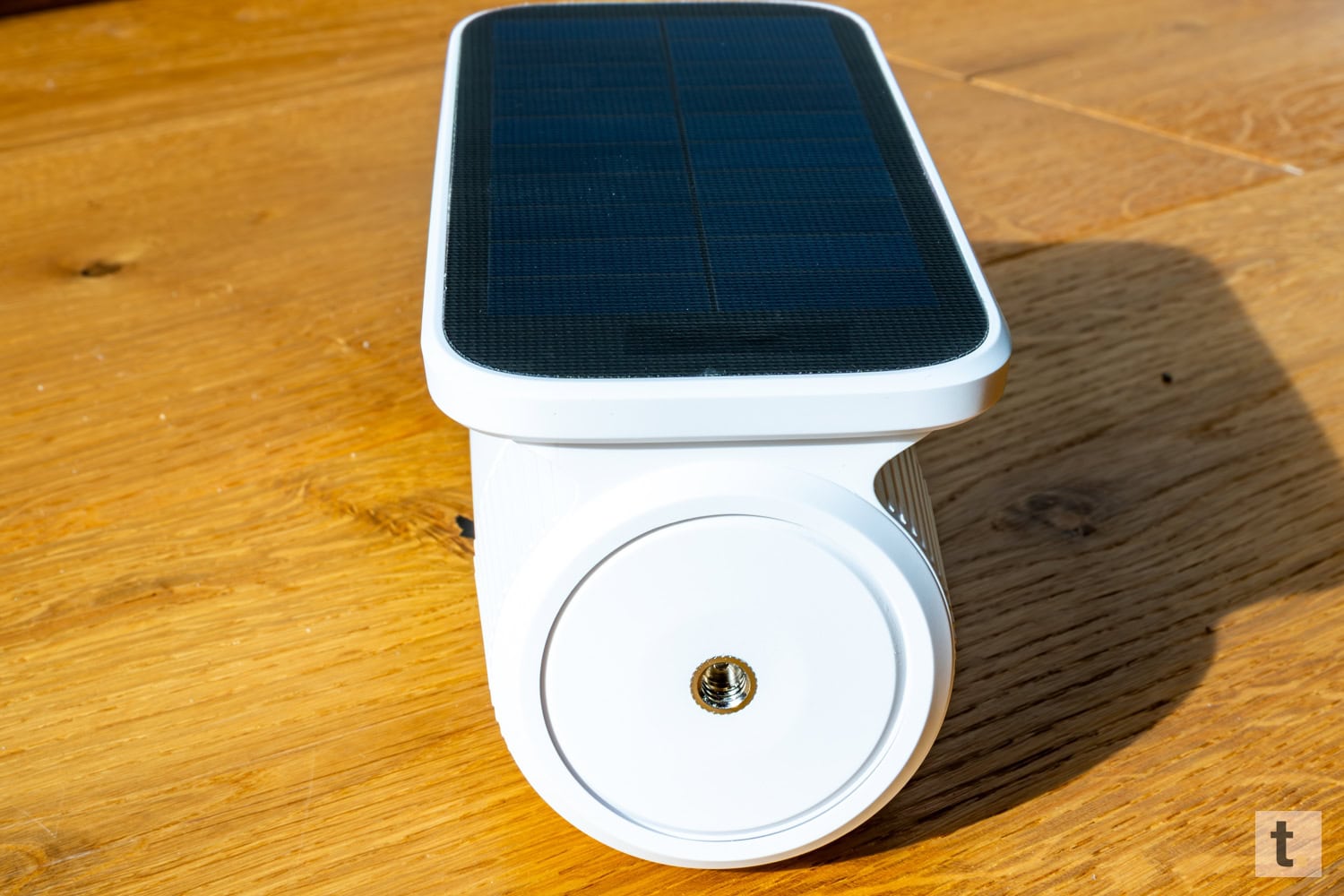 Eine Besonderheit stellt das integrierte, motorisierte Solarpanel auf der Oberseite dar. Dieses ist nicht starr verbaut, sondern wird von einem kleinen Motor angetrieben und richtet sich automatisch nach dem Sonnenverlauf aus. Dadurch optimiert die Kamera selbstständig die Energieaufnahme im Tagesverlauf, was einen klaren technischen Vorteil gegenüber klassischen, feststehenden Solarpanels darstellt.