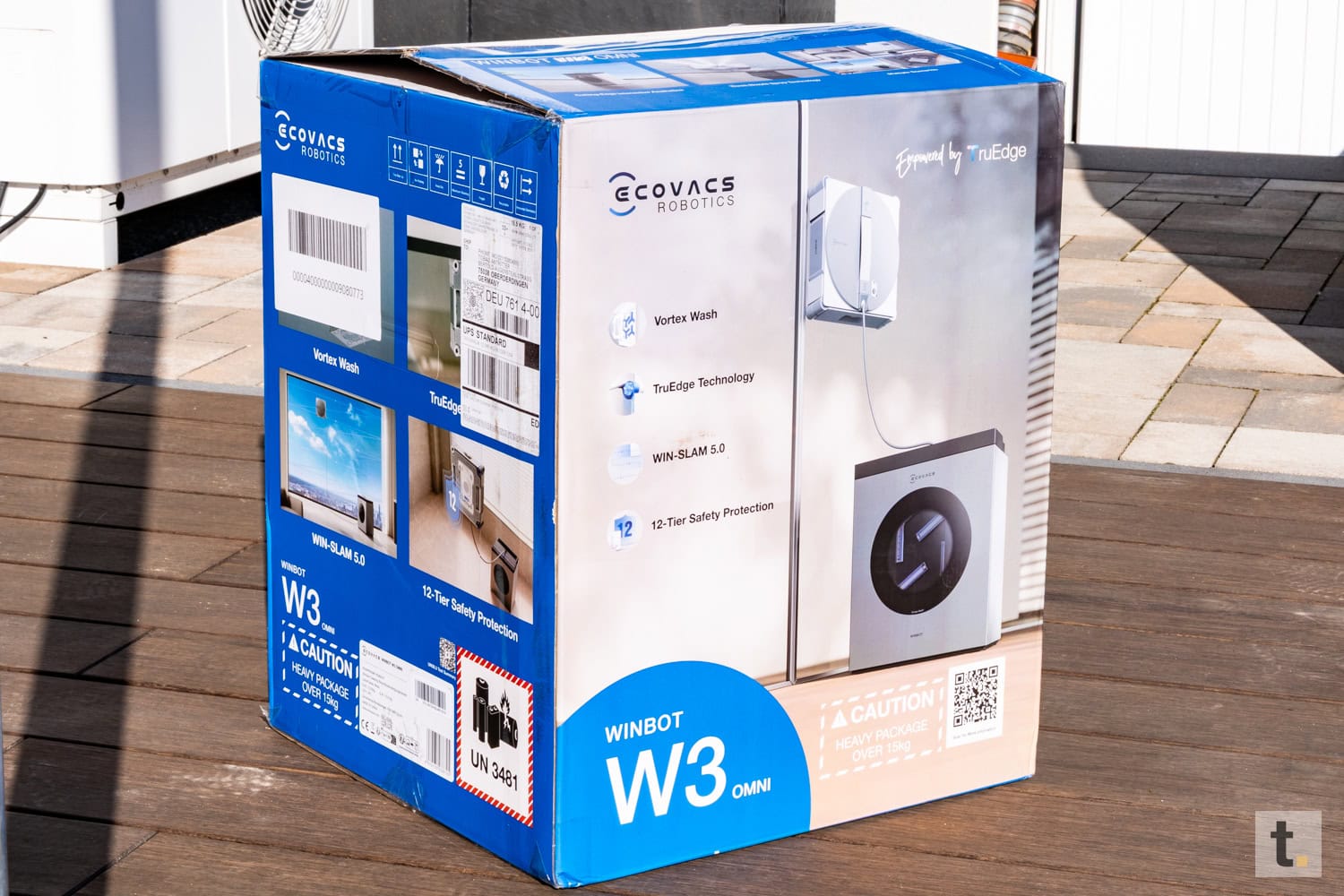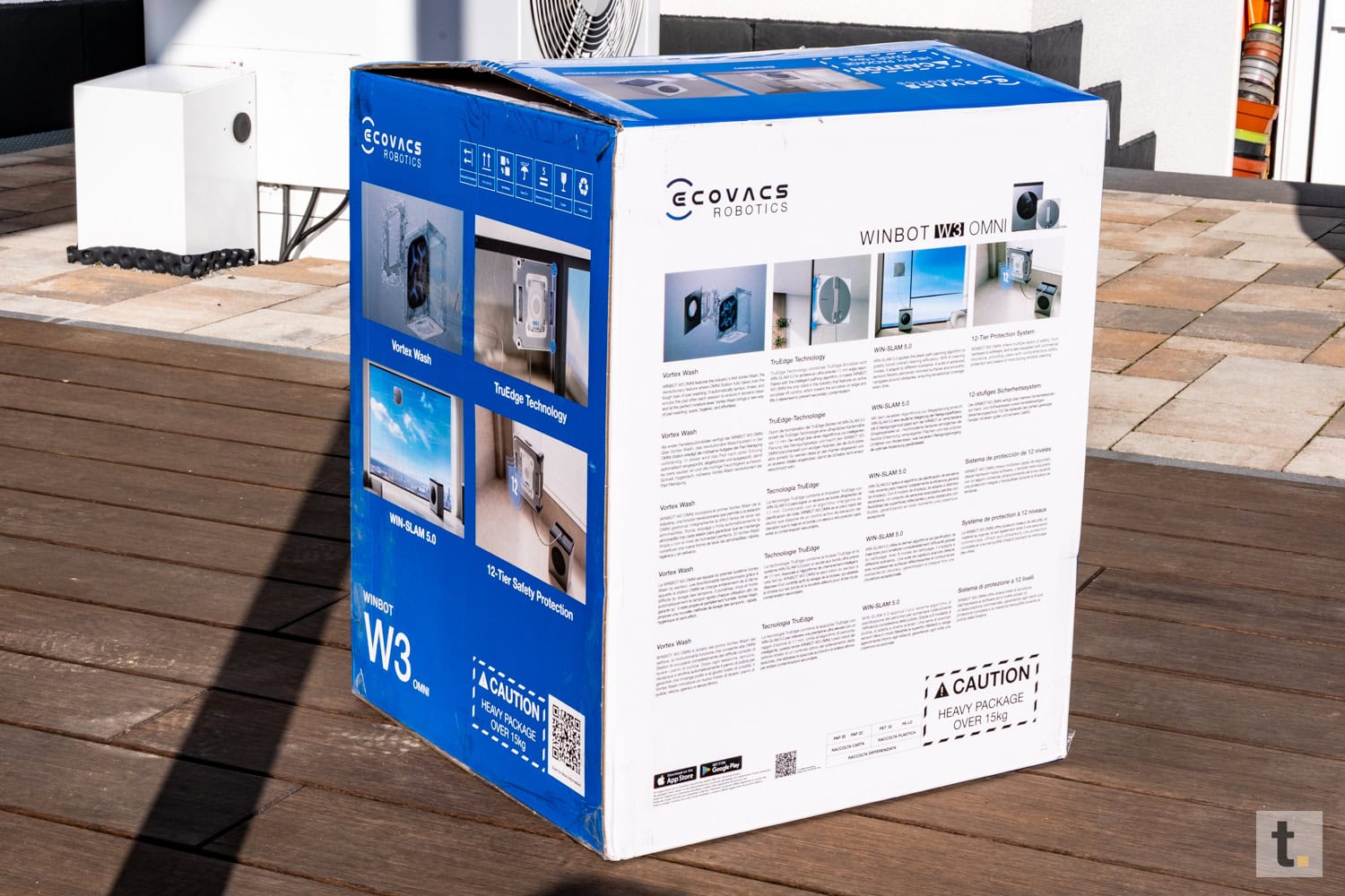 Die Verpackung des Ecovacs Winbot W3 OMNI vermittelt bereits bei der ersten Betrachtung einen Premium-Anspruch. Der Karton zeichnet sich durch eine hochwertige Verarbeitung und ein modernes, aufgeräumtes Design aus. Auf der Vorderseite dominiert eine großformatige Produktabbildung, welche den Fensterputzroboter in Kombination mit der OMNI-Station präsentiert. Ergänzt wird diese Darstellung durch zentrale Marketing-Claims, die insbesondere die automatische Reinigung der Wischpads und den hohen Grad der Automatisierung hervorheben.