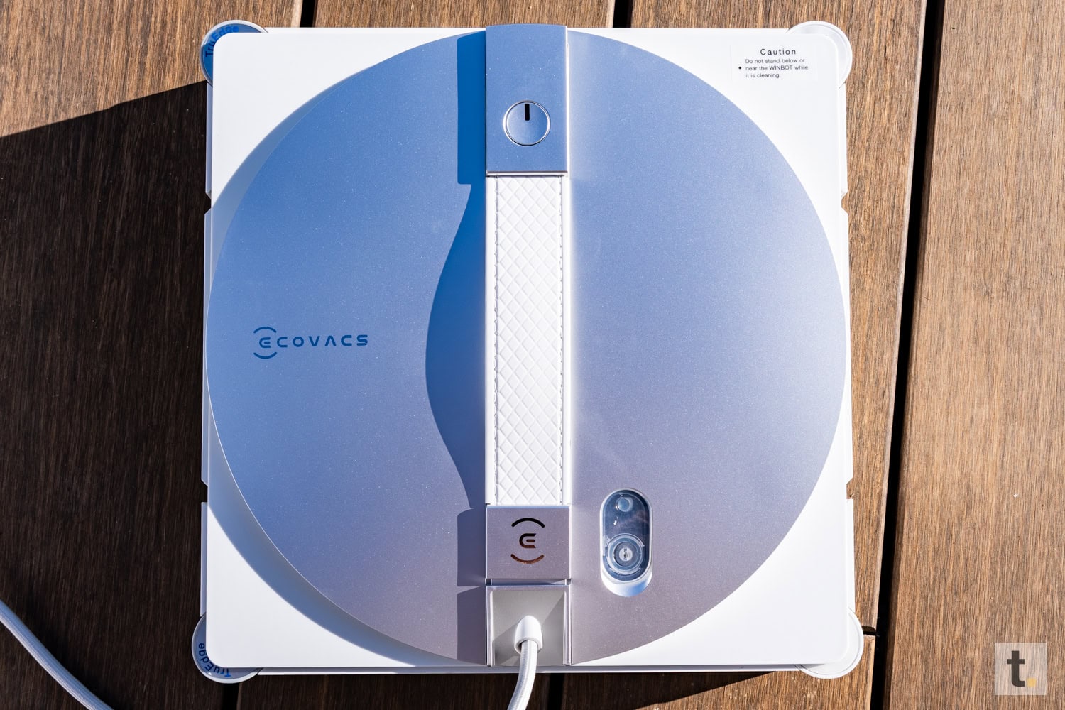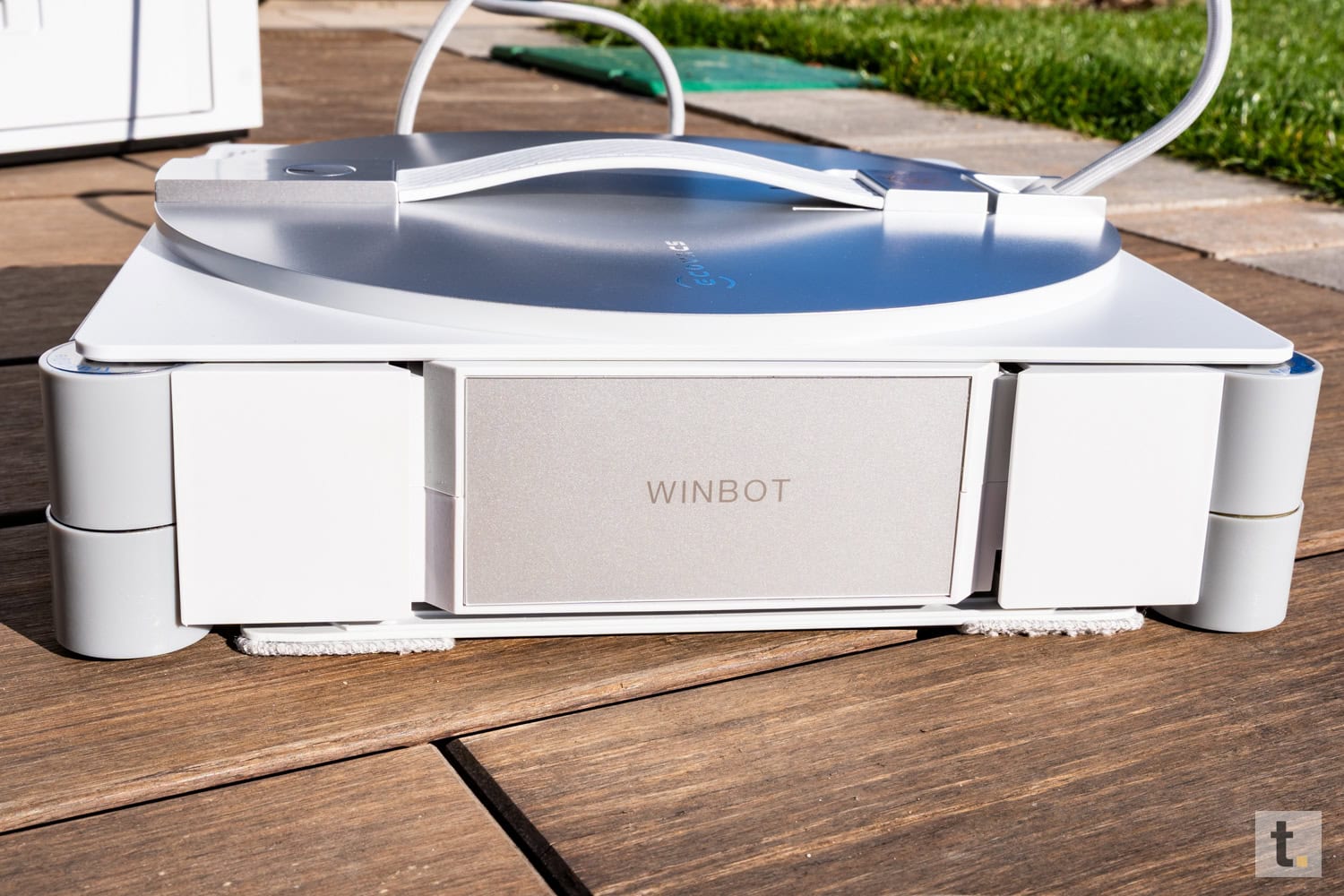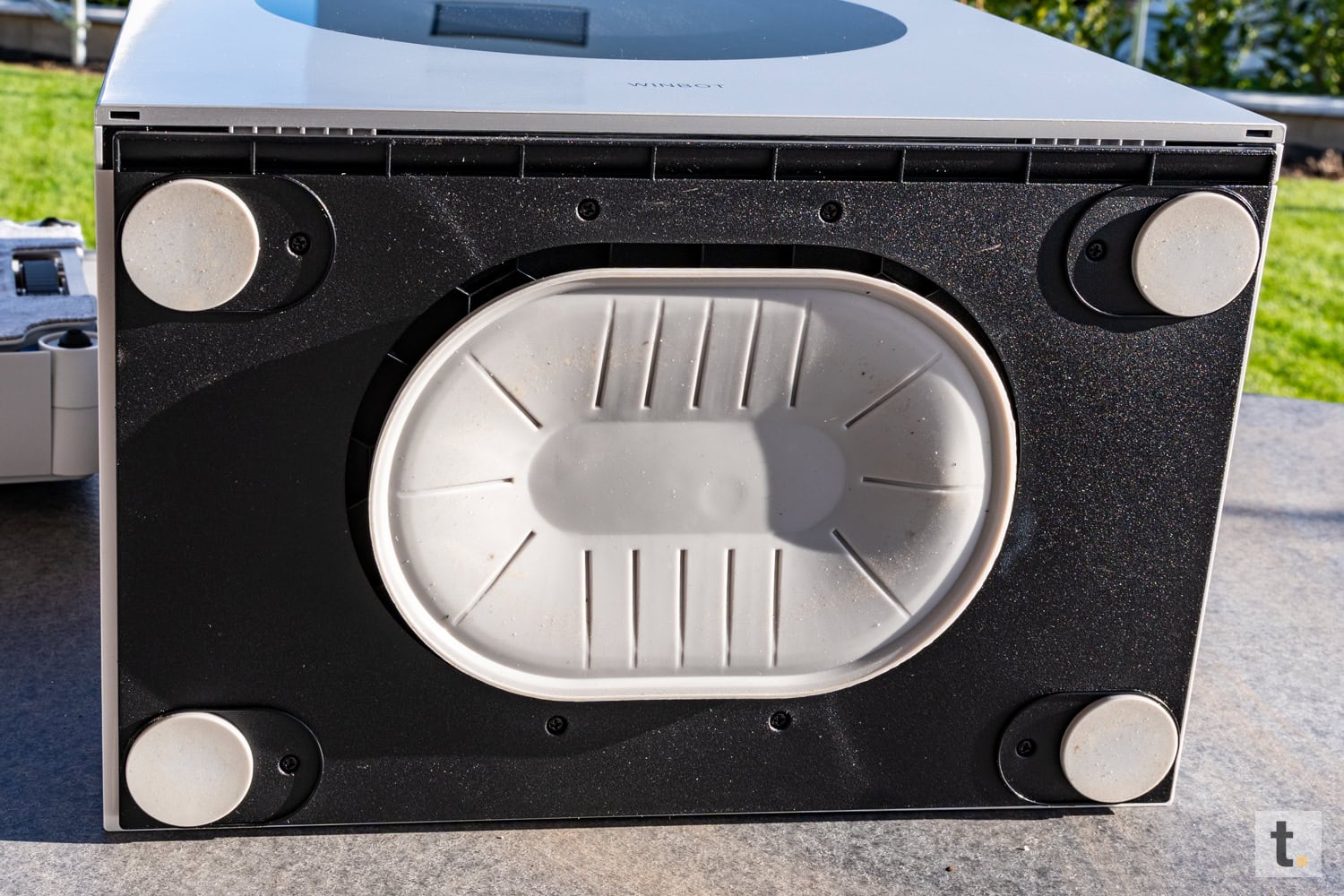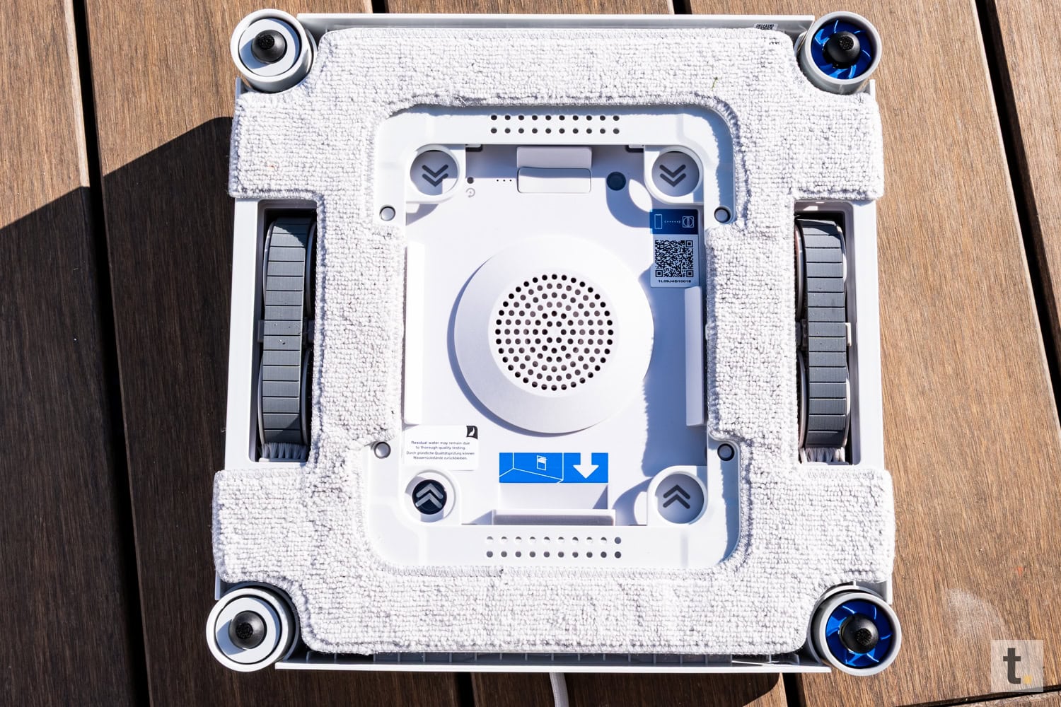 Besondere Aufmerksamkeit gilt der Unterseite des Geräts, auf der sich die Reinigungspads sowie die Antriebselemente, welche für die Haftung an der Glasfläche verantwortlich zeichnen, befinden. Die Komponenten sind mit höchster Präzision verarbeitet und so angeordnet, dass sie sowohl funktional als auch optisch harmonisch wirken. Insgesamt vermittelt der Winbot einen robusten und gleichzeitig eleganten Eindruck und positioniert sich eindeutig als Hightech-Haushaltshelfer.