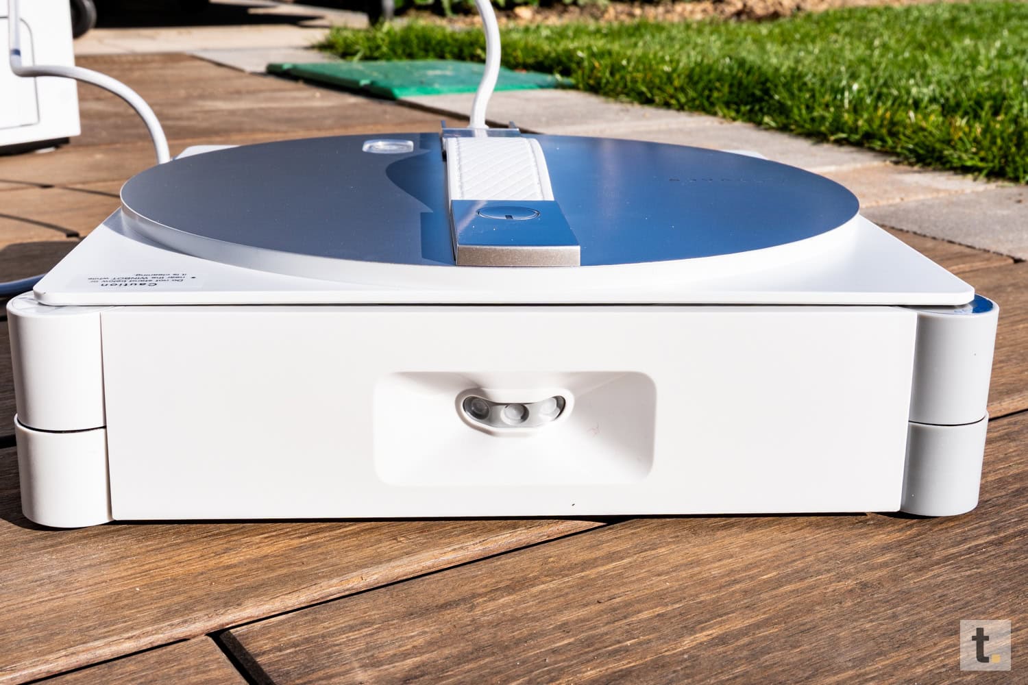Die OMNI-Station setzt dieses Designprinzip konsequent fort und erweitert es um eine deutlich robustere und standfeste Bauweise. Sie präsentiert sich als kompakte Basisstation mit klar definierten Flächen und einer hochwertigen Kunststoffverarbeitung. Besonders hervorzuheben ist die integrierte Klappe, hinter der sich der Stauraum für Akku, Netzkabel und Sicherheitsseil befindet. Diese Lösung gewährleistet nicht nur eine geordnete Aufbewahrung, sondern unterstreicht auch den funktionalen Charakter des Designs.