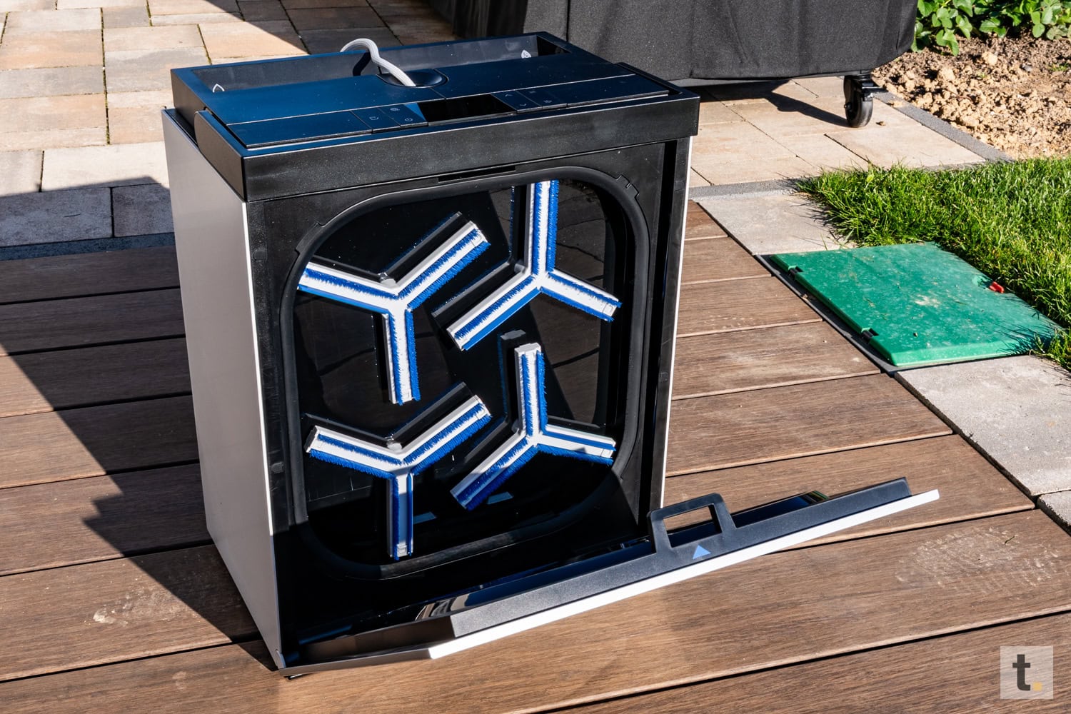 Die OMNI-Station entspricht diesen Anforderungen in nichts nach. Sie wirkt stabil, standsicher und ebenfalls sauber verarbeitet. Klappen und Abdeckungen lassen sich präzise öffnen und schließen, ohne zu haken oder billig zu wirken. Das Fach für Akku und Zubehör ist ordentlich integriert und zeugt von der Berücksichtigung der Alltagstauglichkeit. An der Unterseite ist die Station mit einem großen Saugnapf ausgestattet, der ein Verrutschen verhindert. Dies ermöglicht beispielsweise die sichere Platzierung auf dem Dach des Wintergartens während der Reinigung.