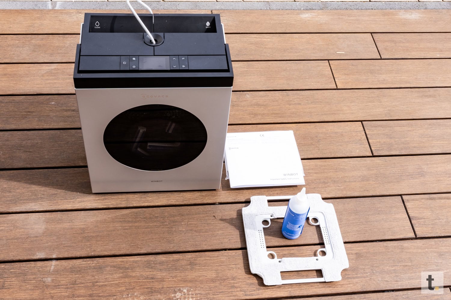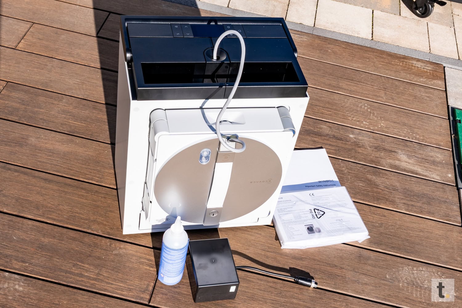 Zum Lieferumfang gehören neben dem Fensterputzroboter selbst die OMNI-Station, der Akku, ein Netzkabel, ein Sicherheitsseil zur zusätzlichen Absicherung, mehrere Reinigungspads sowie eine Flasche mit 230 ml der Reinigungsflüssigkeit. Des Weiteren umfasst das Paket eine Bedienungsanleitung zur Inbetriebnahme. Die Verpackung wirkt insgesamt durchdacht, hochwertig und vollständig und entspricht somit dem Premiumanspruch des Geräts.