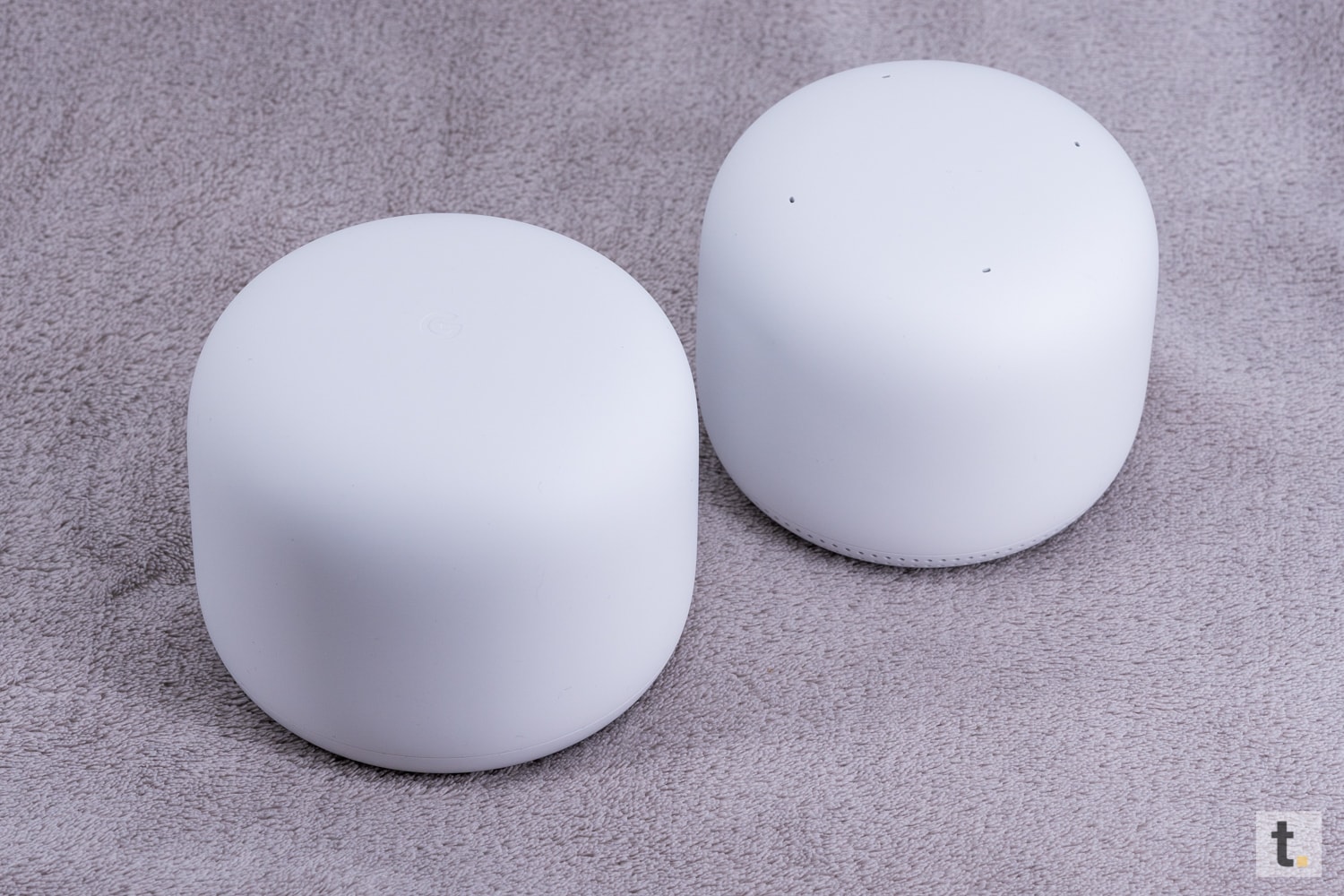 Durch das minimalistisch und zugleich schlichte Design verzichtet Google rundum auf Knöpfe, die das Design unterbrechen würden und auch die wenigen vorhanden Anschlüsse hat man an der Rückseite im unteren Abschnitt versteckt. Der Router des Google Nest WiFi-Set, bei dem es sich um das Hauptgerät handelt, besitzt eine kleinere Aussparung an der Unterseite, hinter der sich drei Anschlüsse verstecken. Der Stromanschluss mittig und rechts sowie links daneben einen 1-Gigabit-Ethernet-Port. Der linke davon von unten betrachtet, bleibt einem jedoch nicht frei zur Verfügung, denn dieser muss mit einem Modem verbunden werden. An der Unterseite des Nest-WiFi ist zudem der QR-Code eingebracht, der benötigt wird, um das System einzurichten. Im Anti-Tusch Gummi ist zudem im vorderen Bereich ein Reset Knopf versteckt, der lediglich dazu dient, das System z. B. beim Verkauf oder bei einem Fehler zurückzusetzen. Das es sich hierbei um ein Google Produkt handelt, erkennt man hier definitiv nicht auf dem ersten Blick. Erst vom Nahen betrachten erkennt man das leicht eingeprägte „G“ an der Oberseite des Routers, welches jedoch nur wenige als ein Produkt von Google deuten würden.