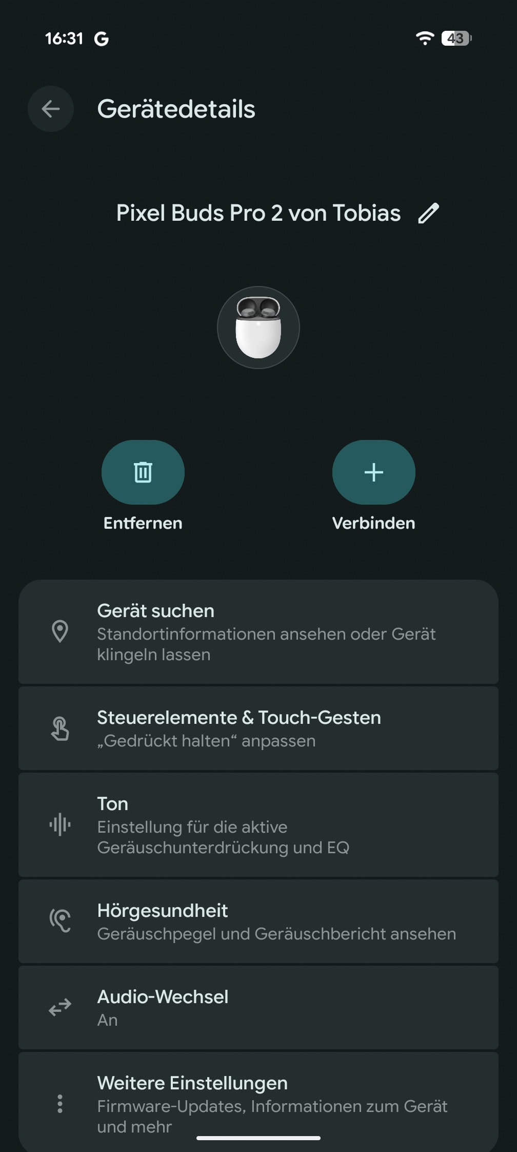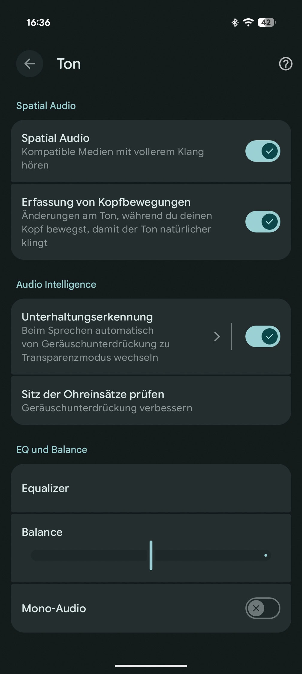 Unterhalb der Funktion „Gerät suchen“ sehen Sie den letzten aktiven Standort Ihrer In-Ears. Sie können auch einen Ton abspielen lassen, um sie leichter zu finden. Im Abschnitt „Touchbedienung“ erfahren Sie, welche Geste welche Funktion auslöst. Im separaten Untermenü können Sie die Berühren-und-Halten-Funktion personalisieren. Dort können Sie beispielsweise festlegen, welche Geste die Geräuschunterdrückung und den Google Assistant steuert. Im Abschnitt „Ton“ können Sie alles rund um das ANC einstellen. Sie können beispielsweise festlegen, dass bei einer Unterhaltung automatisch vom Geräuschunterdrückungsmodus in den Transparenzmodus gewechselt wird. Außerdem können Sie hier den Sitz der Ohrhörer überprüfen und den Equalizer einstellen.