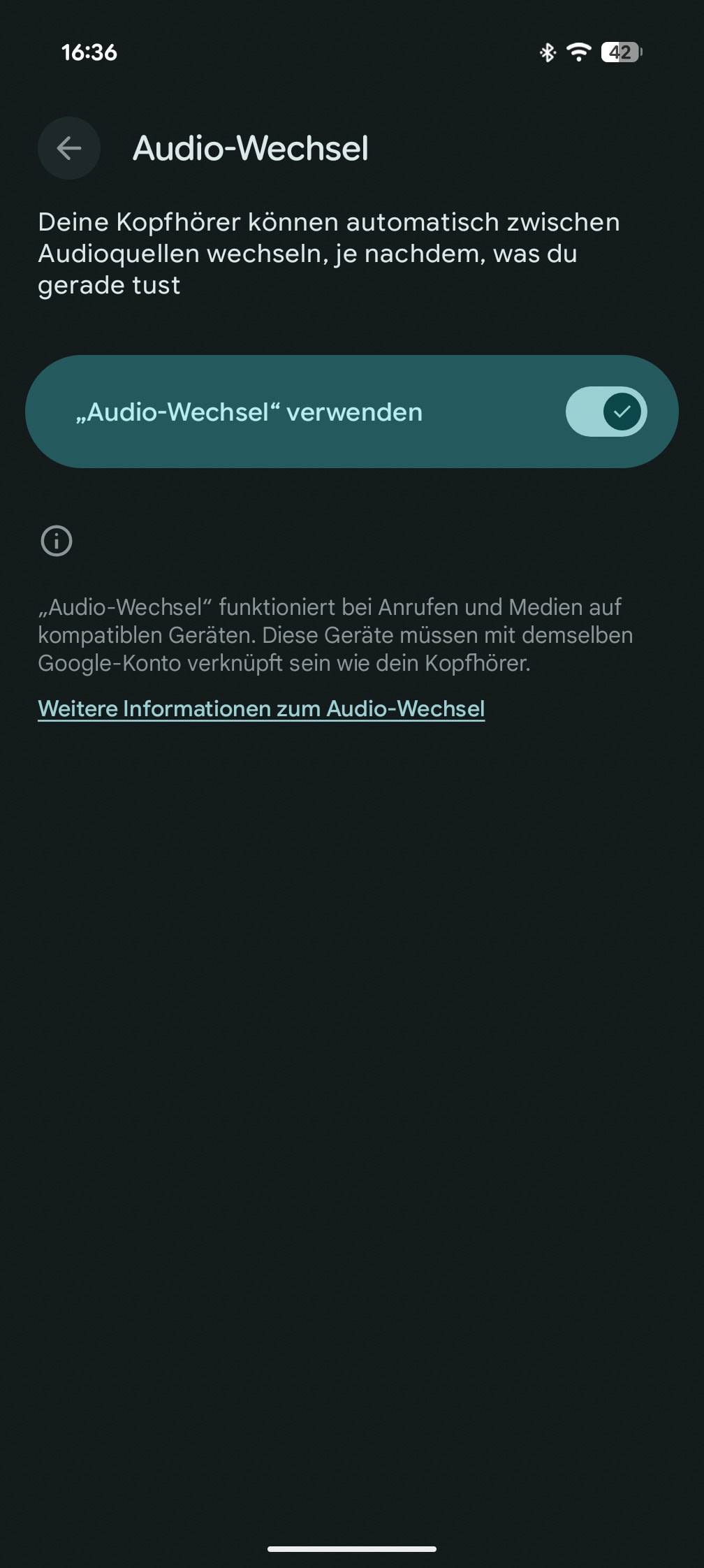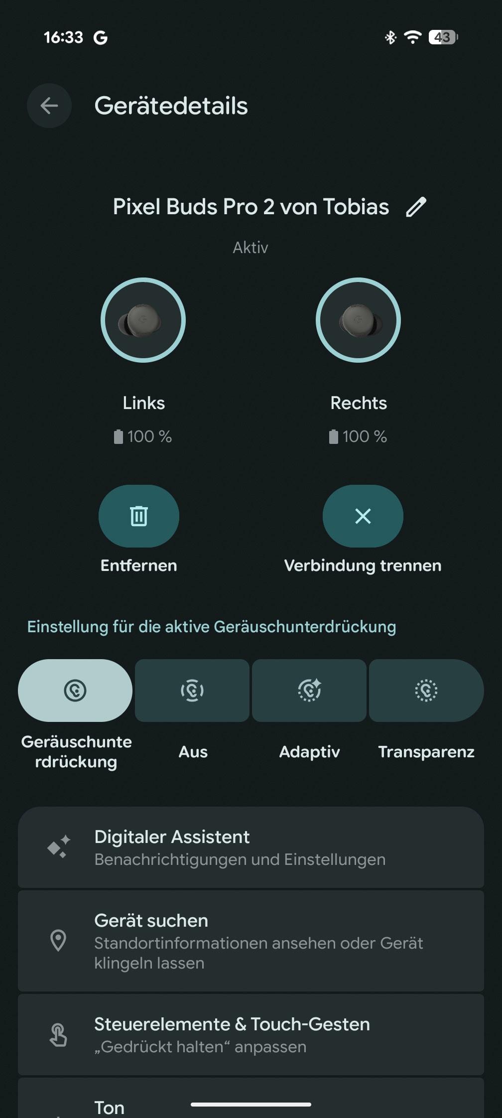 Google hat das Active Noise Cancelling (ANC) der Pixel Buds Pro 2 weiter verbessert. Im Test konnte ich feststellen, dass Hintergrundgeräusche noch etwas besser herausgefiltert werden. Das Brummen einer Klimaanlage und der Straßenverkehr werden deutlich reduziert. Leider lässt sich die Intensität des ANC weiterhin nicht manuell anpassen. Man kann lediglich das Adaptive ANC nutzen, das die Intensität je nach Situation automatisch anpasst. Eigene Einstellungen sind hier nicht möglich.