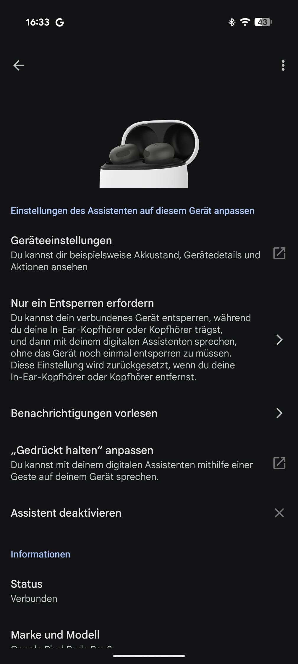 Auf der Startseite werden euch oben neben dem Namen der In-Ears der Akkustand in Prozent vom linken und rechten In-Ear separat einzeln angezeigt. Direkt darunter könnt ihr die Aktive Geräuschunterdrückung an- oder ausschalten oder den Transparenzmodus aktivieren. Darunter folgen zahlreiche weitere Untermenüs, die kurz und knapp beschreiben, was ihr damit einstellen könnt. Ganz oben findet ihr das Untermenü „Digitaler Assistant“, in dem ihr alles bezüglich des smarten Assistenten einstellen könnt, z. B. ob Benachrichtigungen vorgelesen werden sollen, ob Hey Google aktiv sein soll oder ob ein Startton zu Beginn ertönen soll.