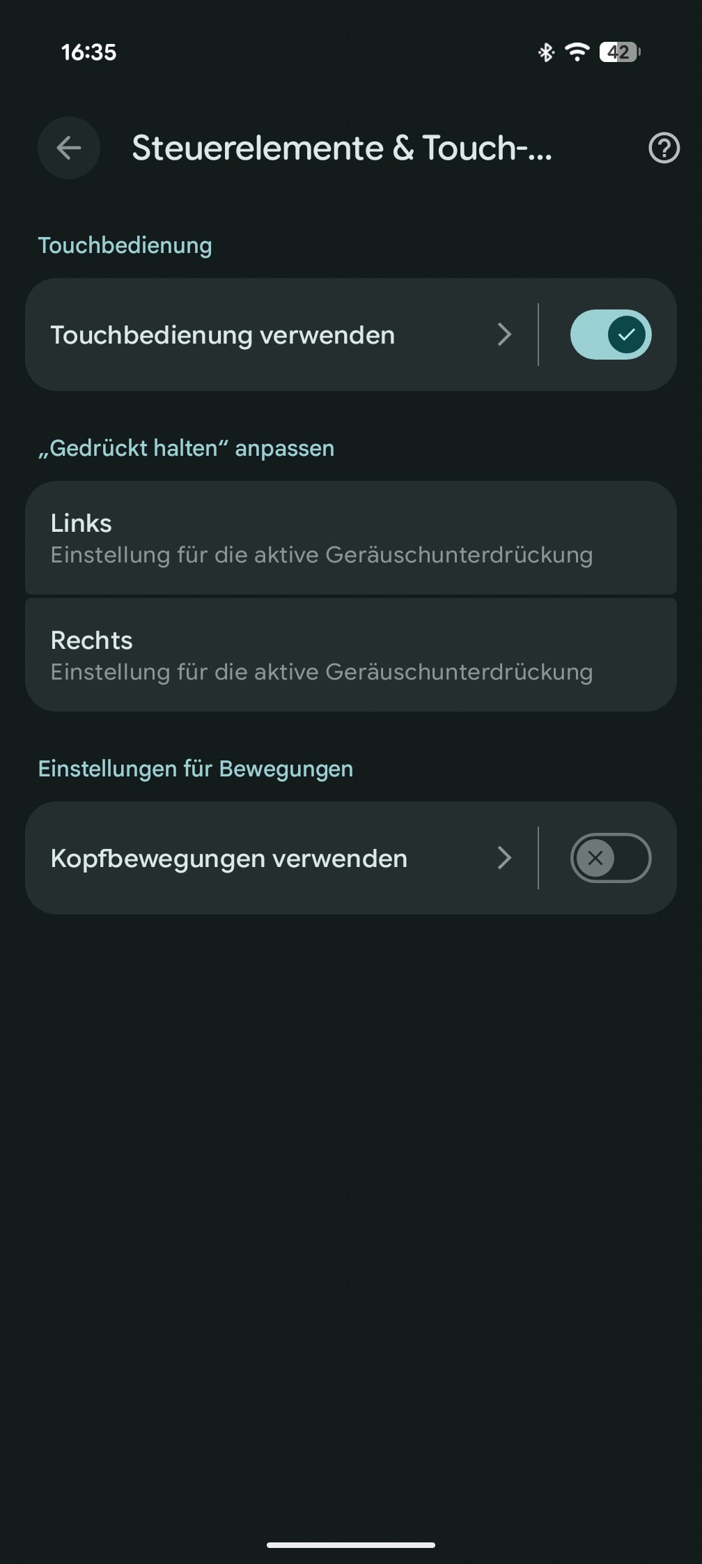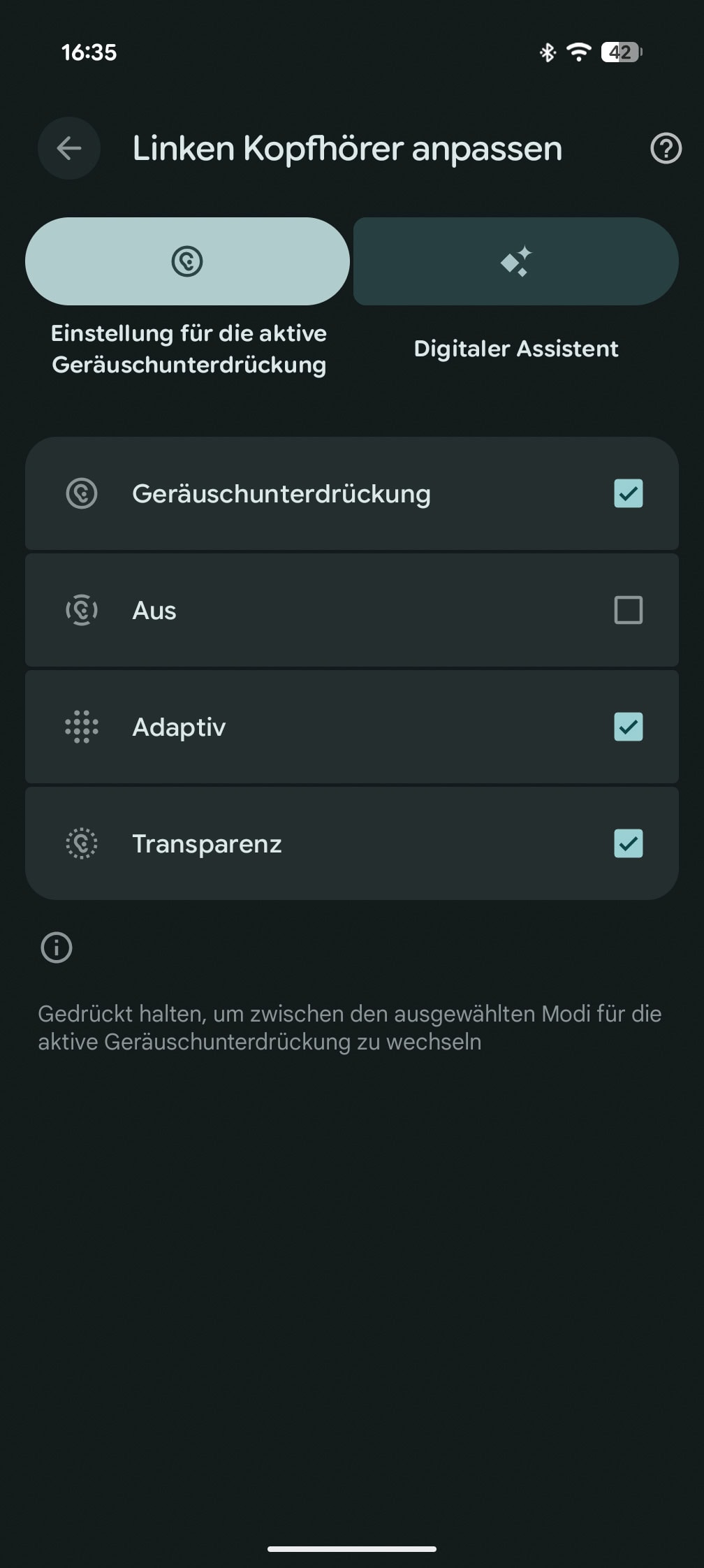 Praktisch finde ich, dass man in der App beispielsweise festlegen kann, dass durch längeres Berühren des rechten Ohrhörers die ANC-Einstellungen geändert werden können, während der linke Ohrhörer auf den Befehl wartet, um den Google Assistant zu aktivieren. Darüber hinaus kann man entscheiden, ob man alle drei ANC-Einstellungen (ANC ein, Transparenzmodus und alles aus) zur Auswahl haben möchte oder ob man bestimmte Optionen deaktivieren möchte, die dann beim Wechseln der Modi nicht mehr angezeigt werden.