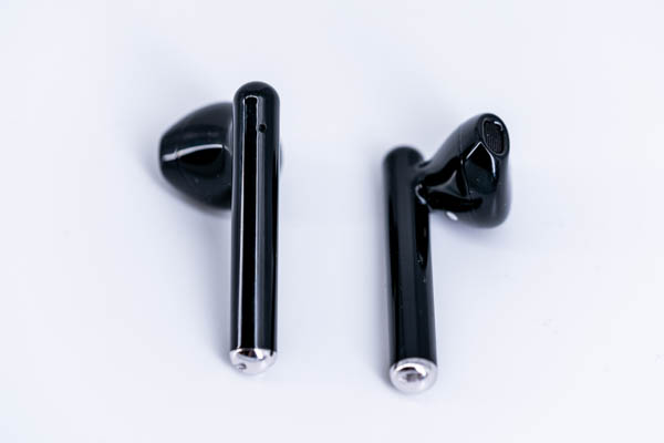 Das Gehäuse der Ohrhörer besteht aus insgesamt drei Teilen. Dem länglichen runden Teil, in dessen inneren sich nicht nur der Akku befindet, sondern auch das Mikrofon, welches am unteren Ende, unter der Chrom-Abdeckung platziert wurde. Dieser lange „Mast“ verläuft etwas höher wie das Treibergehäuse, welches sehr nach dem der Apple AirPods ausschaut. Hier drin befindet sich der Großteil der Elektronik, wie z. B. die Hauptplatine, der Kirin A1 Chip und der 14 mm Treiber.