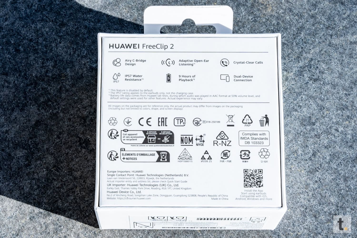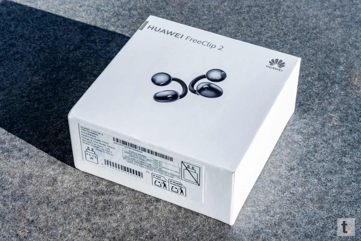 Die Huawei FreeClip 2 Kopfhörer werden in einer kompakten, stabilen Kartonverpackung mit schlichtem, modernem Design präsentiert. Die Vorderseite der Verpackung zeigt ein großes Produktbild der Kopfhörer sowie den Modellnamen. Die Gestaltung wirkt hochwertig und übersichtlich. Auf der Rückseite befinden sich technische Daten sowie Informationen zu den wesentlichen Funktionen.