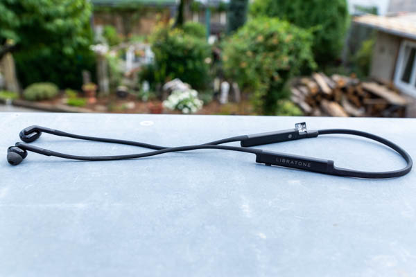 So befindet sich unterhalb des rechten Ohrhörer, sämtliche Steuerelemente in einer 3-Tasten-Fernbedienung, die sich beim Tragen auf Halshöhe befindet. Auch der integrierte Akku kann hier durch einen Micro-USB-Anschluss aufgeladen werden. In dem linken Aluminium-Element, welches mit „LIBRATONE“ beschriftet ist, ist nicht nur der Akku verbaut, sondern auch der Ein-/Ausschaltknopf.