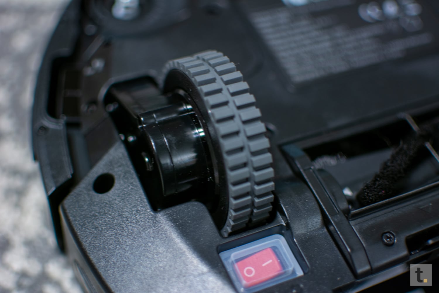 Von unten betrachtet befindet sich direkt vorne die schwarz-weiße Ausgleichsrolle und daneben die beiden Ladekontakte, mit welchen der Saugroboter zum aufladen auf die Ladestation fährt. Davor wiederum befinden sich zwei der insgesamt 6 Fallschutz-Sensoren, damit der Saugroboter keine Treppen herunterfällt. Die restlichen vier befinden sich spiegelbildlich neben den beiden großen gefederten Antriebsrädern. Diese Räder sind gefedert, sodass der Saugroboter auch Höhenunterschiede wie z. B. einen Teppich überfahren kann. Vor diesen beiden Rädern findet man die Antriebe und Befestigungspunkte für die seitlich rotierenden Büsten, welche man nach dem auspacken selbst befestigen muss.