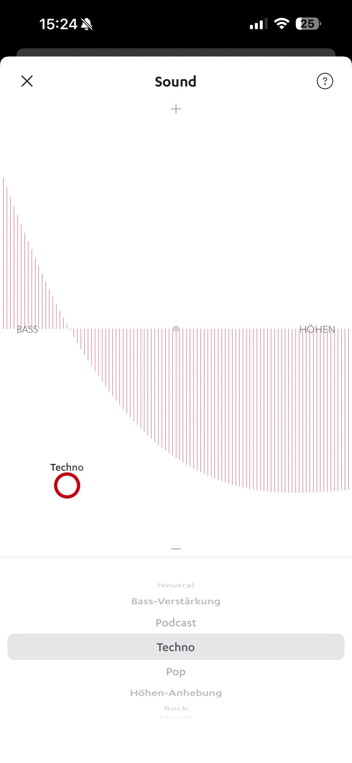 Unter der Darstellung der In-Ear-Kopfhörer, die in der Farbe des gekauften Produkts gehalten ist, befinden sich die beiden essenziellen Funktionen. Diese ermöglichen den direkten Zugriff auf den Equalizer und die Geräuschunterdrückung. Teufel Audio verzichtet auf einen konventionellen Equalizer mit drei oder fünf individuell regulierbaren Bändern und setzt stattdessen auf einen parametrischen Equalizer. Dieser funktioniert ähnlich einem Koordinatensystem, in dem ein Punkt verschoben werden kann, um die Verstärkung bestimmter Musikrichtungen zu visualisieren. Es ist wichtig zu beachten, dass Pegel und Frequenz gleichzeitig angepasst werden; eine separate Regulierung ist nicht möglich. Das Konzept überzeugt jedoch durch seine Benutzerfreundlichkeit und ermöglicht eine schnelle Einarbeitung.