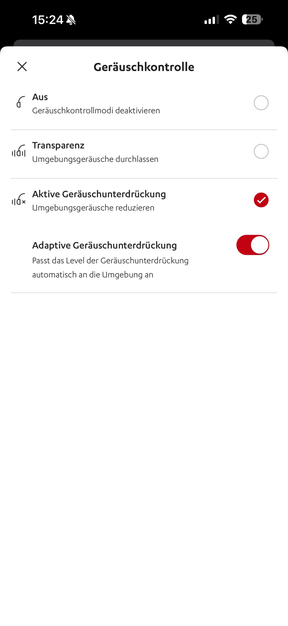 Im Zusammenhang mit der Verlinkung der „Geräuschekontrolle“ stehen Ihnen drei Modi zur Auswahl: Aus, Transparenz und Active Geräuscheunterdrückung. Im Modus „Active Geräuscheunterdrückung“ besteht die Möglichkeit, die adaptive Funktionswiese bei Bedarf zu deaktivieren. Diese Funktion ist standardmäßig aktiviert und passt die Intensität der aktiven Geräuschunterdrückung an die jeweiligen Umgebungsbedingungen an. Ich halte diese Funktion für äußerst nützlich und empfehle daher, sie aktiviert zu lassen.
