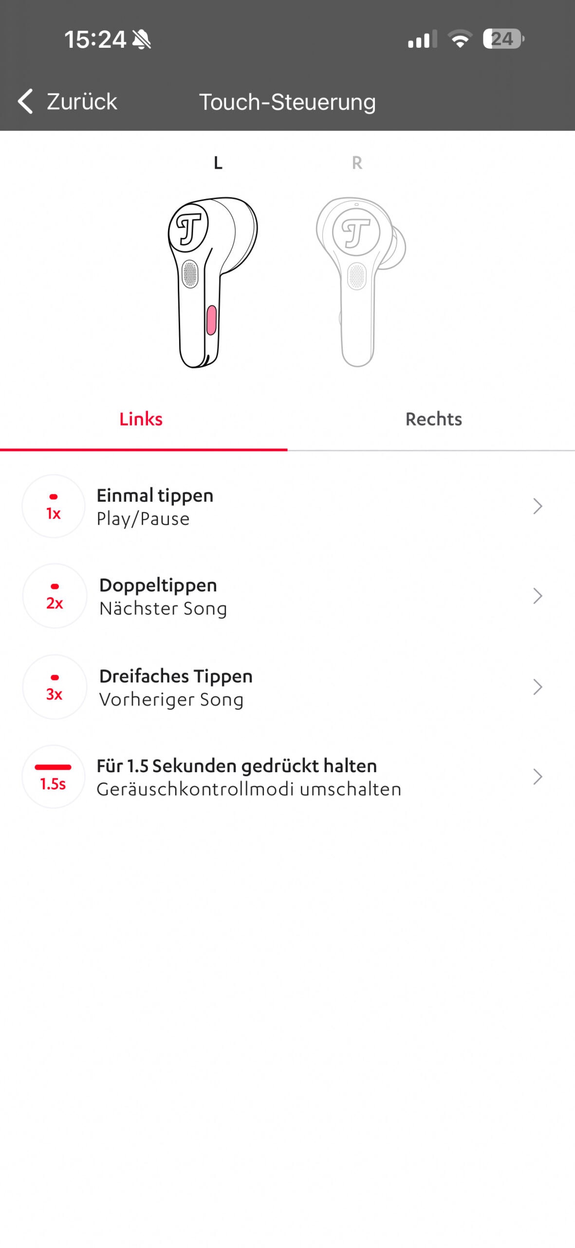 In der Teufel Go-App besteht die Möglichkeit, die Belegung der Drucktasten an individuelle Präferenzen anzupassen. Im täglichen Gebrauch erwies sich die Bedienung über die Drucktaste als schnell und präzise, vergleichbar mit der Bedienung über Tippgesten via Touch. Im Gegensatz zum herkömmlichen Touch-Bedienfeld, bei dem die Steuerung mit einem Finger erfolgt, erfordert die Bedienung über die Drucktasten zwei Finger, um ein Verrutschen des jeweiligen In-Ear-Kopfhörers zu vermeiden. Die Streichgesten zur Lautstärkensteuerung funktionierten im Alltag einwandfrei und erforderten keine Anpassungen.