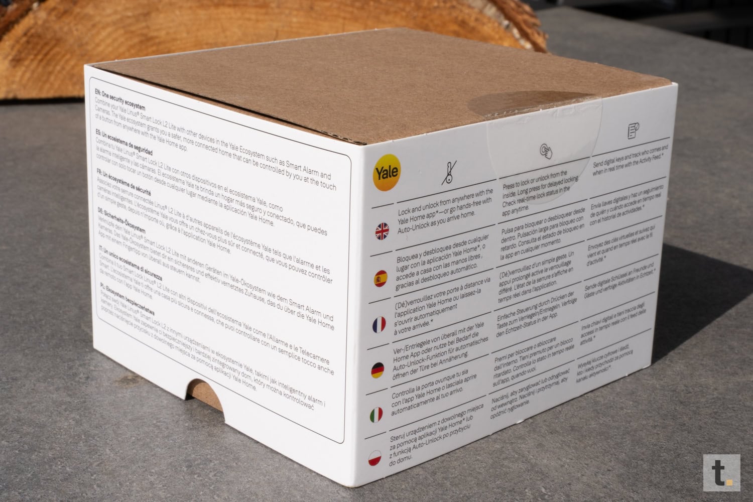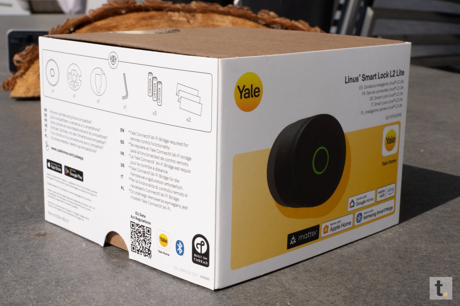 Das Yale Linus Smart Lock L2 Lite wird in einer kompakten und robusten Verpackung präsentiert, die einen hochwertigen und zeitgemäßen Eindruck vermittelt. Die äußere Gestaltung ist schlicht gehalten, mit einer klaren Produktabbildung auf der Vorderseite sowie den wesentlichen Funktionen und Kompatibilitätshinweisen auf der Rückseite. Die Farbgebung dominiert ein dezentes Design in Weiß- und Grautönen, welches typisch für Smart-Home-Produkte aus dem Hause Yale ist.