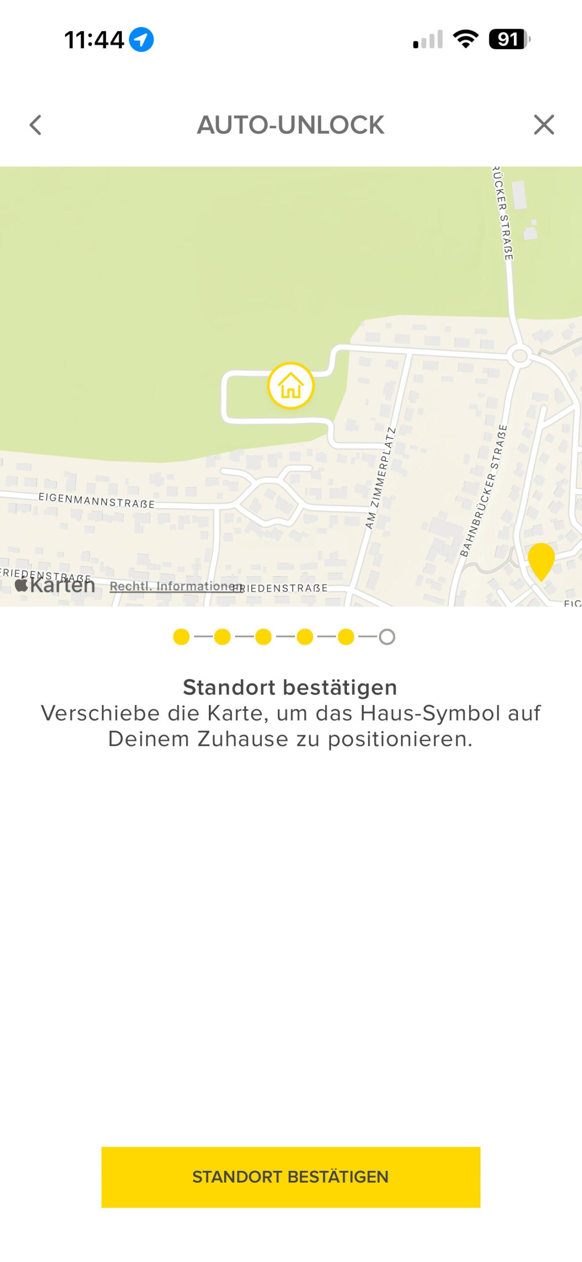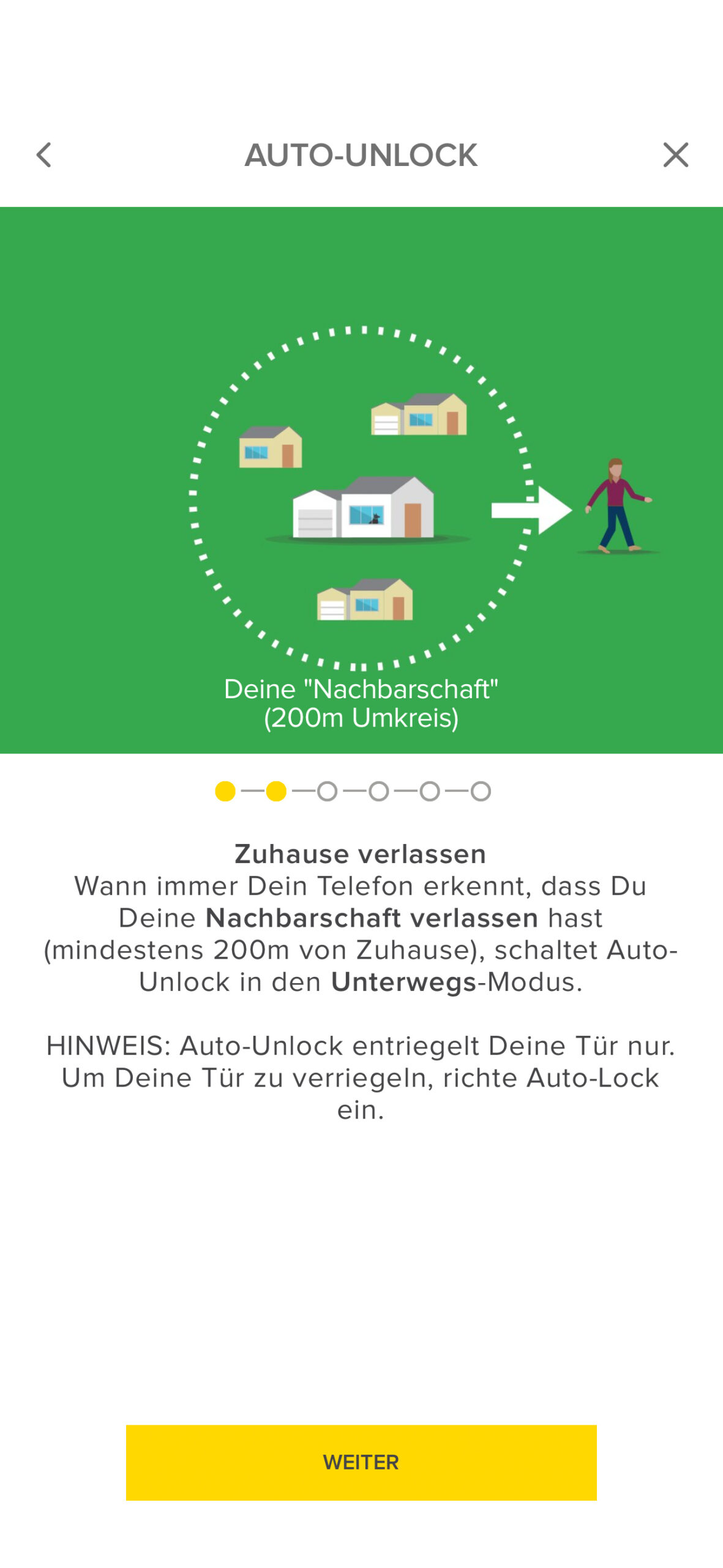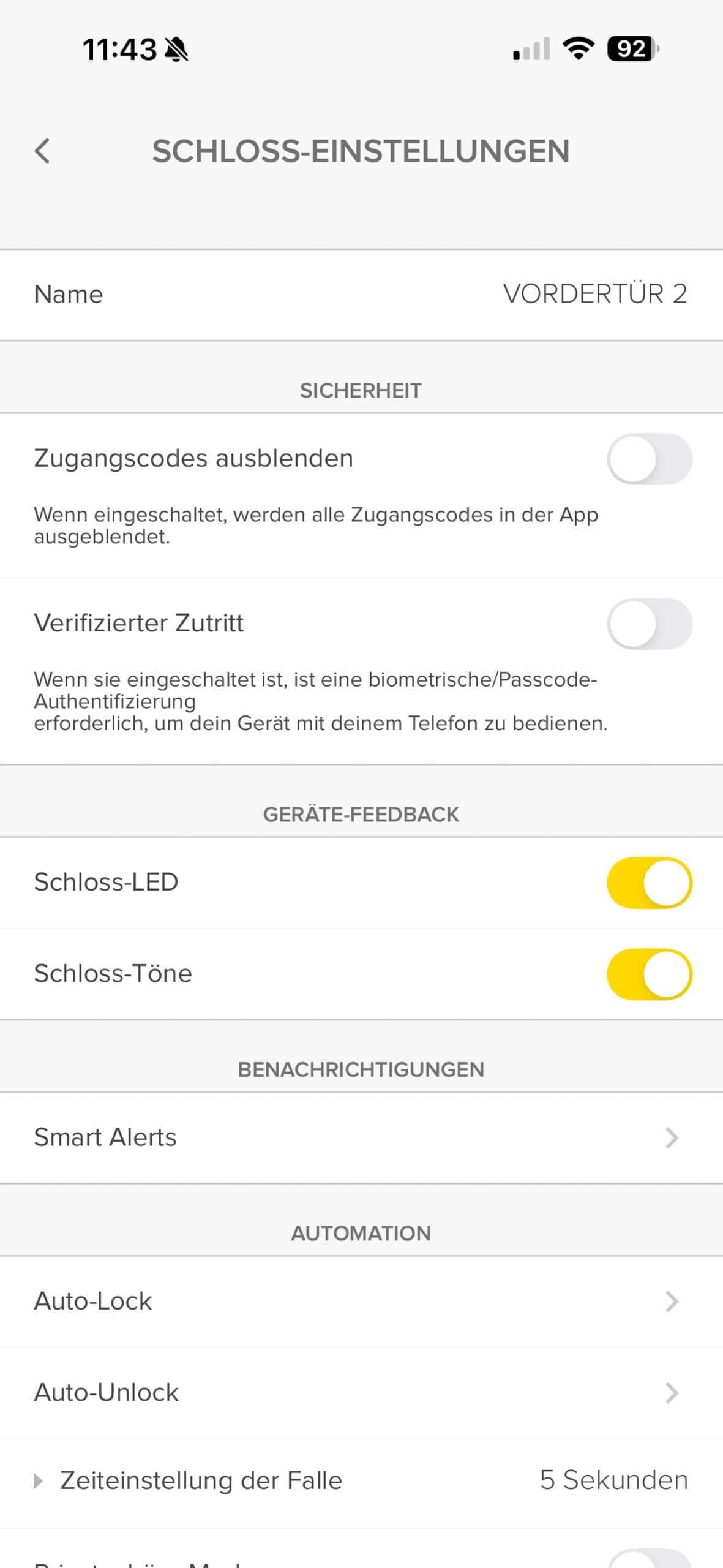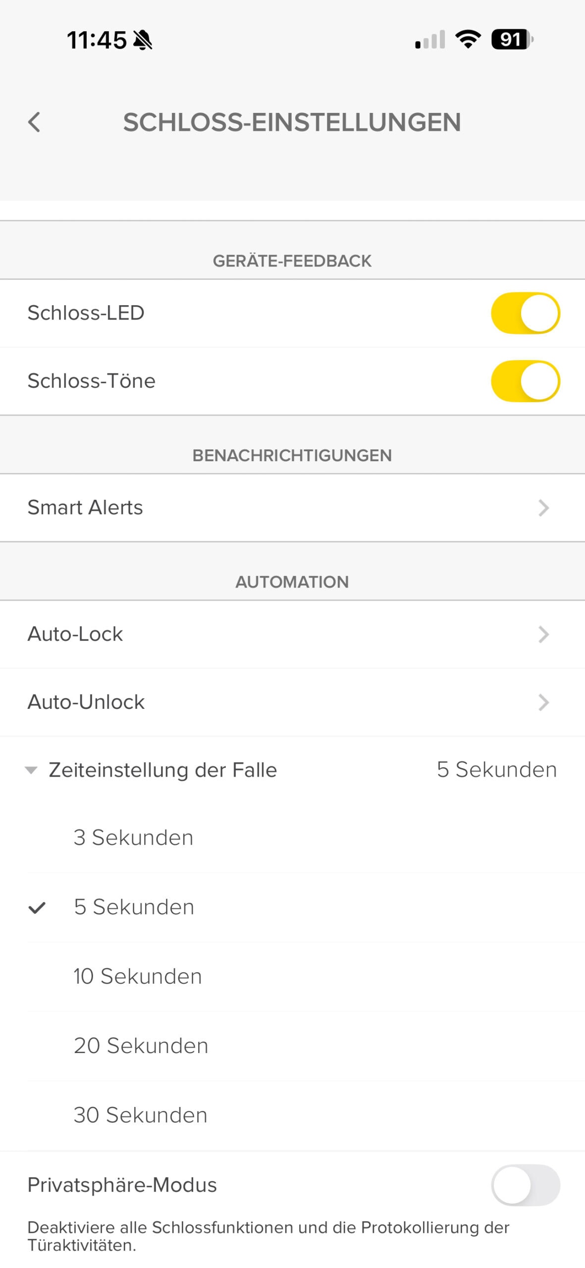 Das Untermenü „Automationen & Auto-Unlock“ ermöglicht die Aktivierung der Auto-Unlock-Funktion, wodurch sich die Tür automatisch öffnet, sobald sich der Nutzer dem Schloss nähert. Des Weiteren können Smart-Home-Automationen über Matter-kompatible Plattformen, beispielsweise Apple Home, Google Home oder Amazon Alexa, eingerichtet werden.